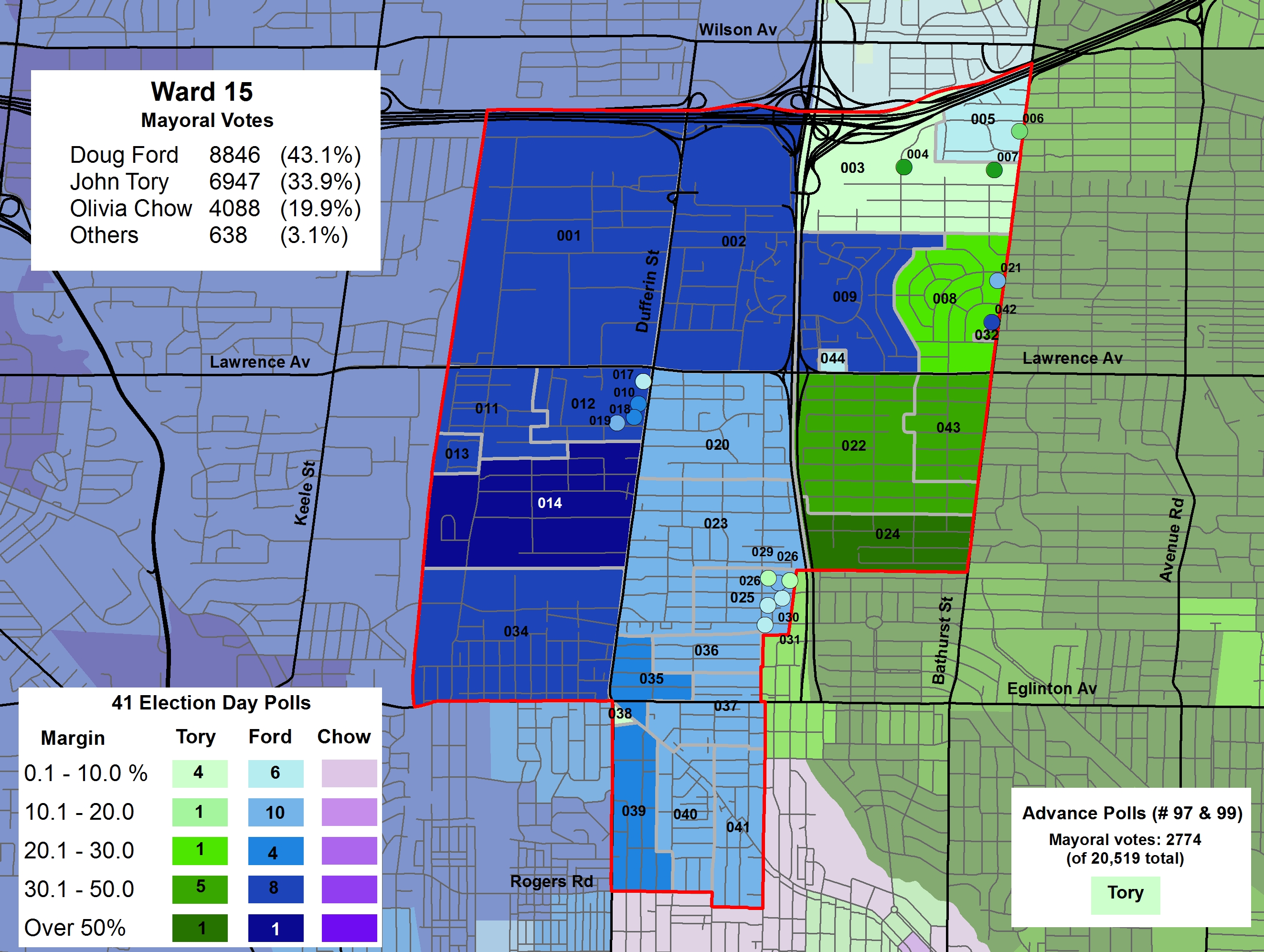 Tory won an astounding 74.8% of all votes cast in Ward 16. This was the highest ward-level result for Tory in the last election and the largest winning margin of any mayoral candidate. Olivia Chow came in a very distant second place with 13.0% of the vote, and Doug Ford placed third, taking only 10.6% of all votes cast. Only one poll, Poll 033, located in a TCHC building, thought differently and voted for Ford. On the other side of Bathurst, in Ward 15, Ford won a plurality of votes cast – 43.1% of the vote – and won 29 polls. Tory won mostly in polls on the eastern edge of the ward, closest to Bathurst Street, Ford won Lawrence Heights and every poll west of Dufferin Street.