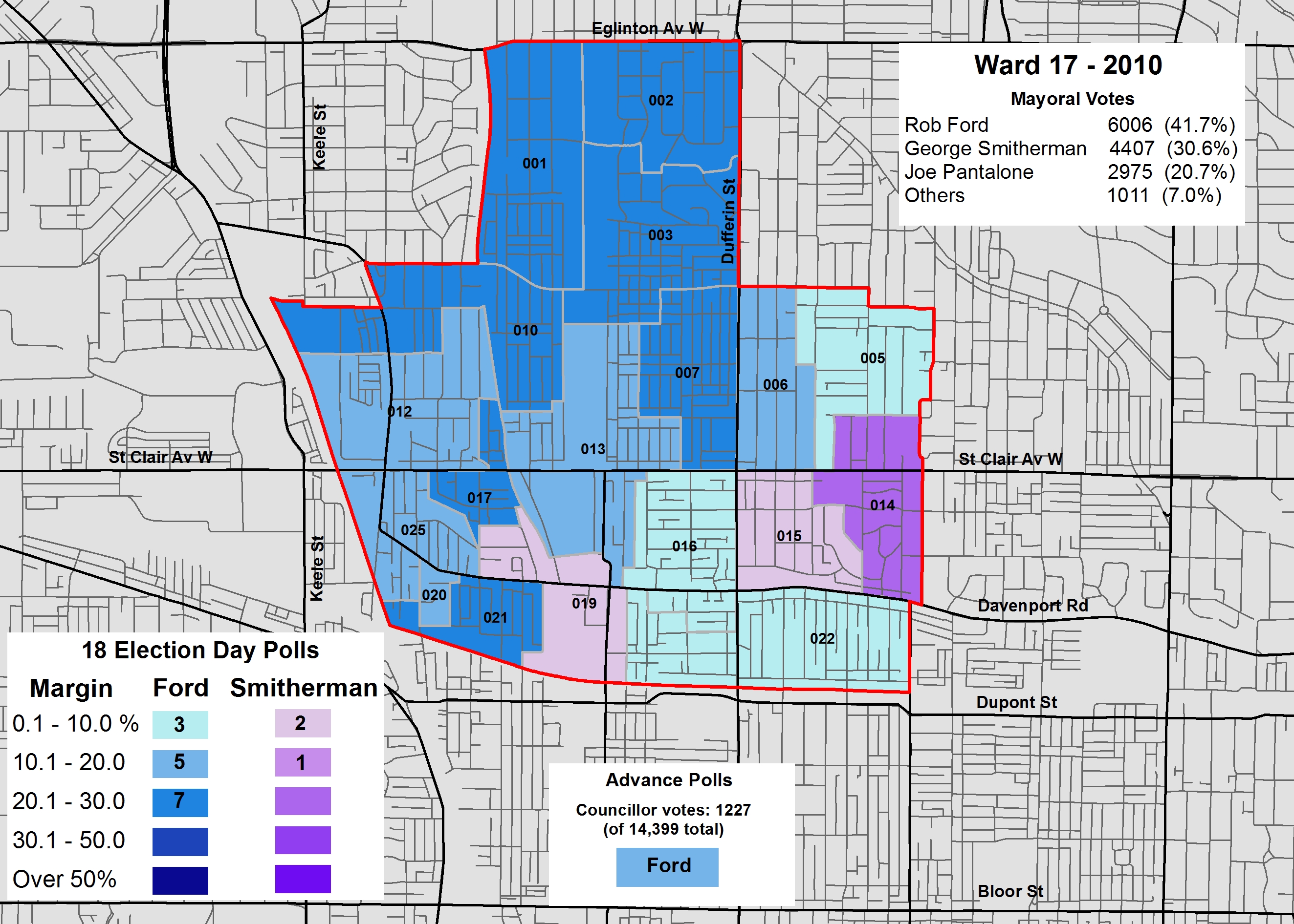 Interestingly, Ward 17 is one of only two polls in which the newly elected mayor, John Tory, came in third place (the other was Ward 8, which I will discuss later). Doug Ford came in first place, with 40.6% of all votes cast for mayor, while Olivia Chow came in second with 31.6%. John Tory came in third, at 24.6%. Chow and Tory were able to place first in several polls south of St. Clair Avenue and east of Dufferin Street, but polls in the northwest quadrant of the ward came out (relatively strongly) in favour of Doug Ford.