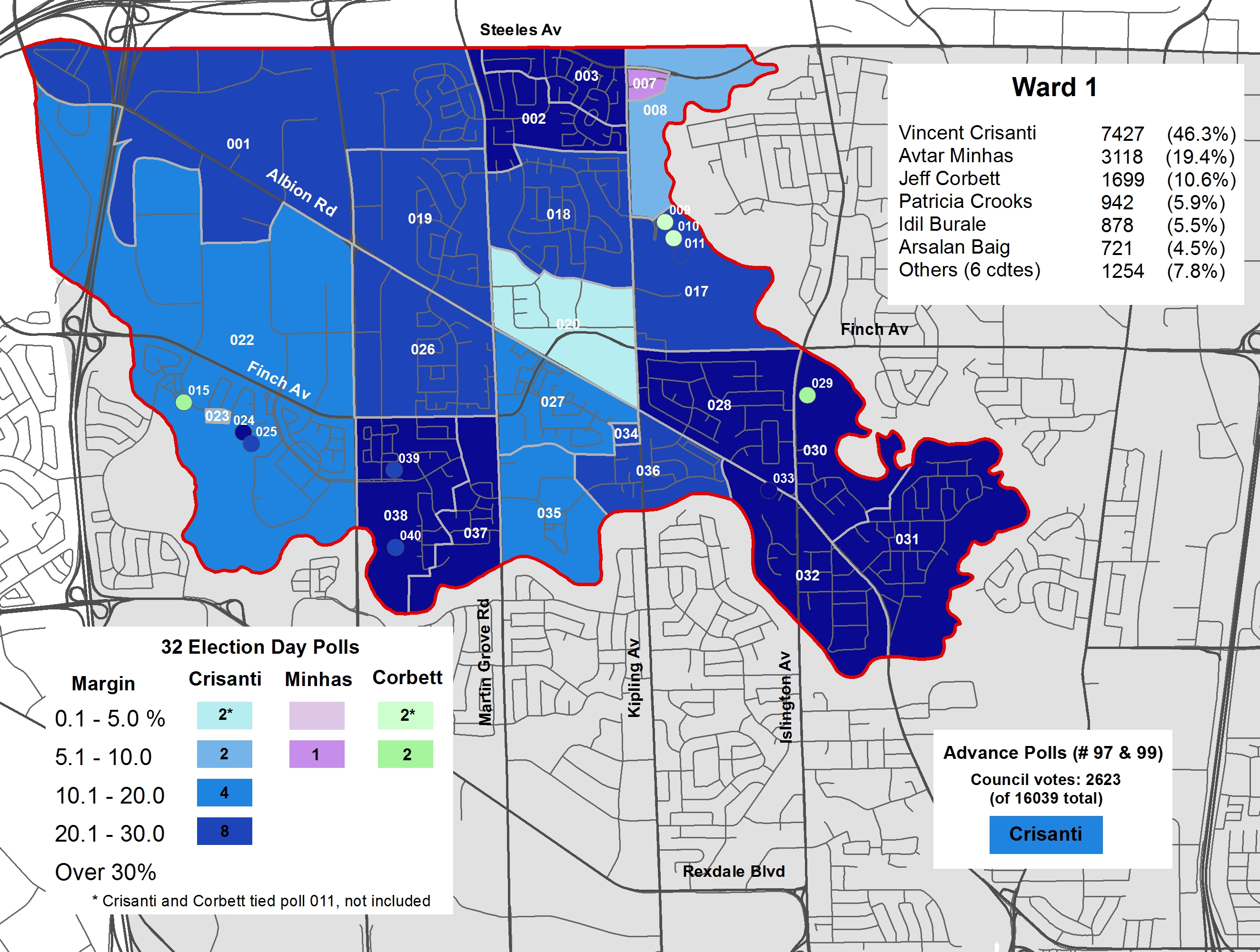 In Ward 1, Crisanti easily won re-election, winning 46.3% of the vote and taking all but six polls. Second-pace Avtar Minhas (who got 19.4% of all votes for city council) won only Poll 007 (a couple of high-rise condos at Kipling and Steeles). Third place Jeff Corbett came first in four high-rise polls. Idil Burale, an inspiring community advocate who earned the respect of many election observers and an endorsement from the Toronto Star, came in a disappointing fifth place; she sadly faced racism and intimidation during the campaign. Happily, Burale remains committed to city building and advocating on behalf of the local community, she is now a featured writer for Spacing Magazine.