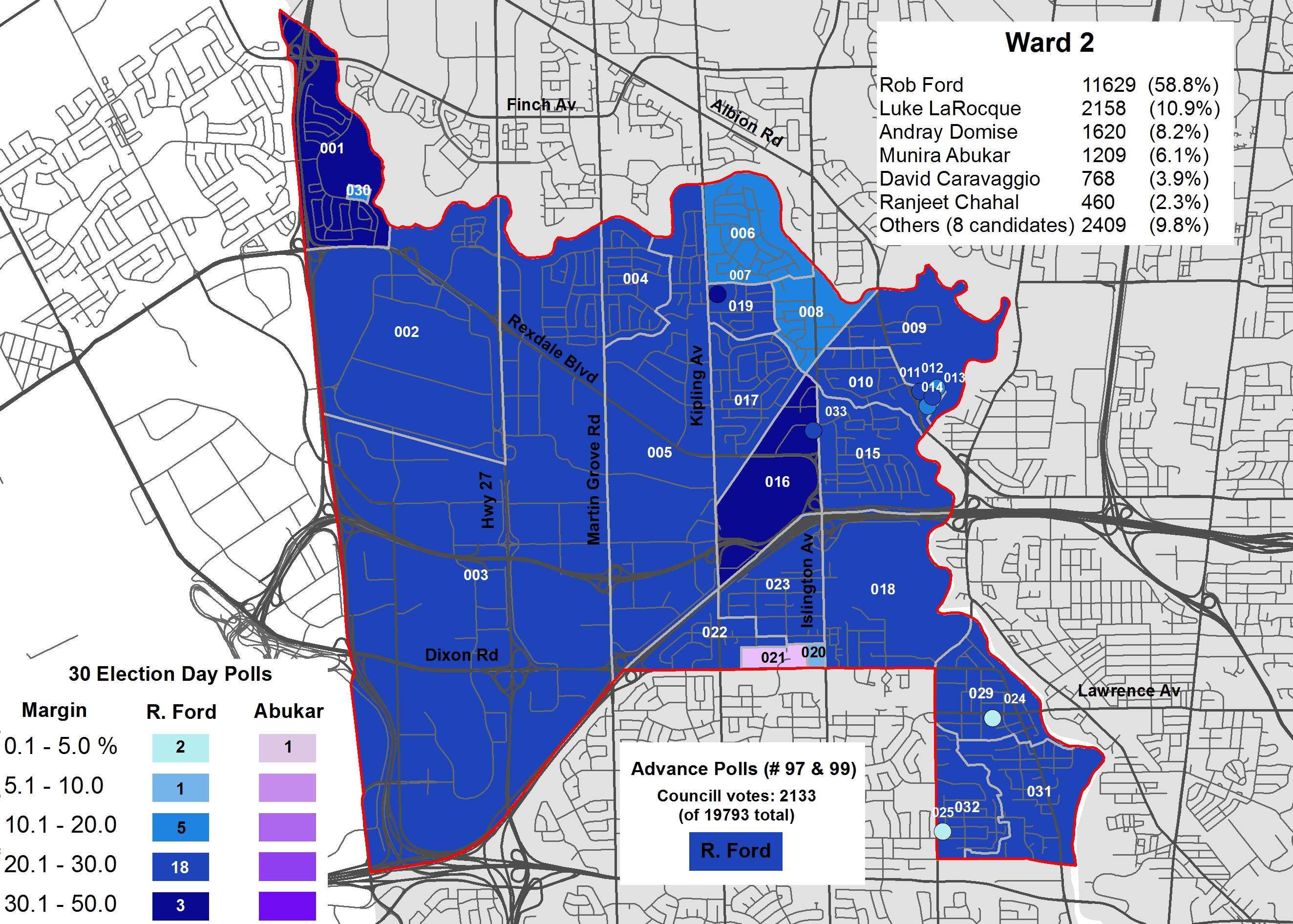On this beautiful sunny Friday afternoon, let’s have a quick look at the results of the 2014 Toronto municipal election in Wards 1 and 2, Etobicoke North. Ward 2 is the Ford’s home turf (Rob Ford and Doug Ford now live in Ward 4, but their mother’s home, the venue for many “Ford Fest” backyard parties is located here, as is the family business, Deco Labels and Tags.