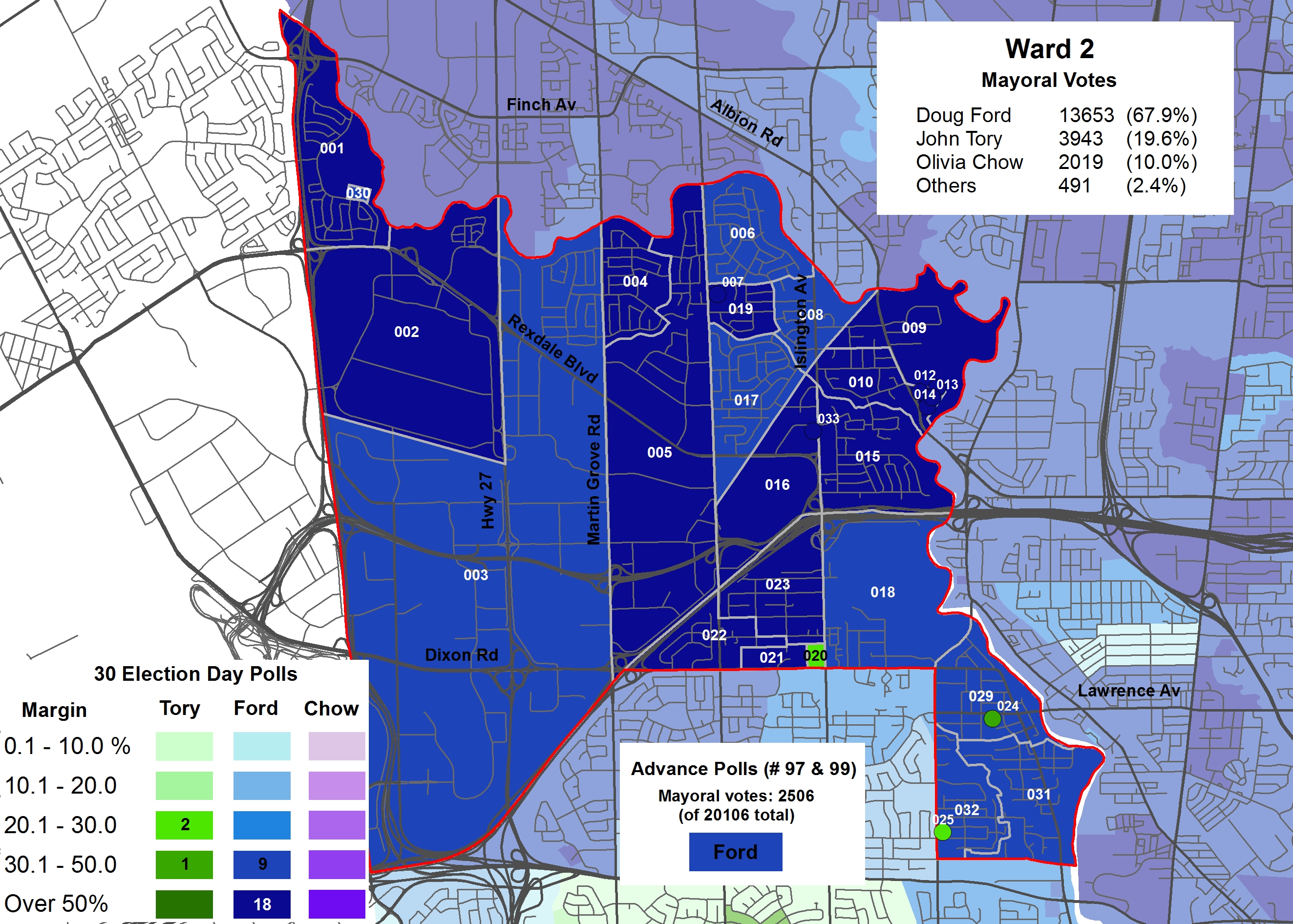 Ward 1 is represented by Ford ally Vincent Crisanti (now one of Mayor John Tory’s four deputy mayors). Doug Ford earned a higher percentage of votes in Ward 1 than any other ward in Toronto, winning the approval of 70.2% of voters there. Not surprisingly, Doug Ford did almost as well in Ward 2, getting 67.9% of the votes there, though John Tory came in first in Poll 020 (a condominium complex nar Dixon and Islington) and Polls 024 and 205, both located in seniors’ homes in the ward’s south end.