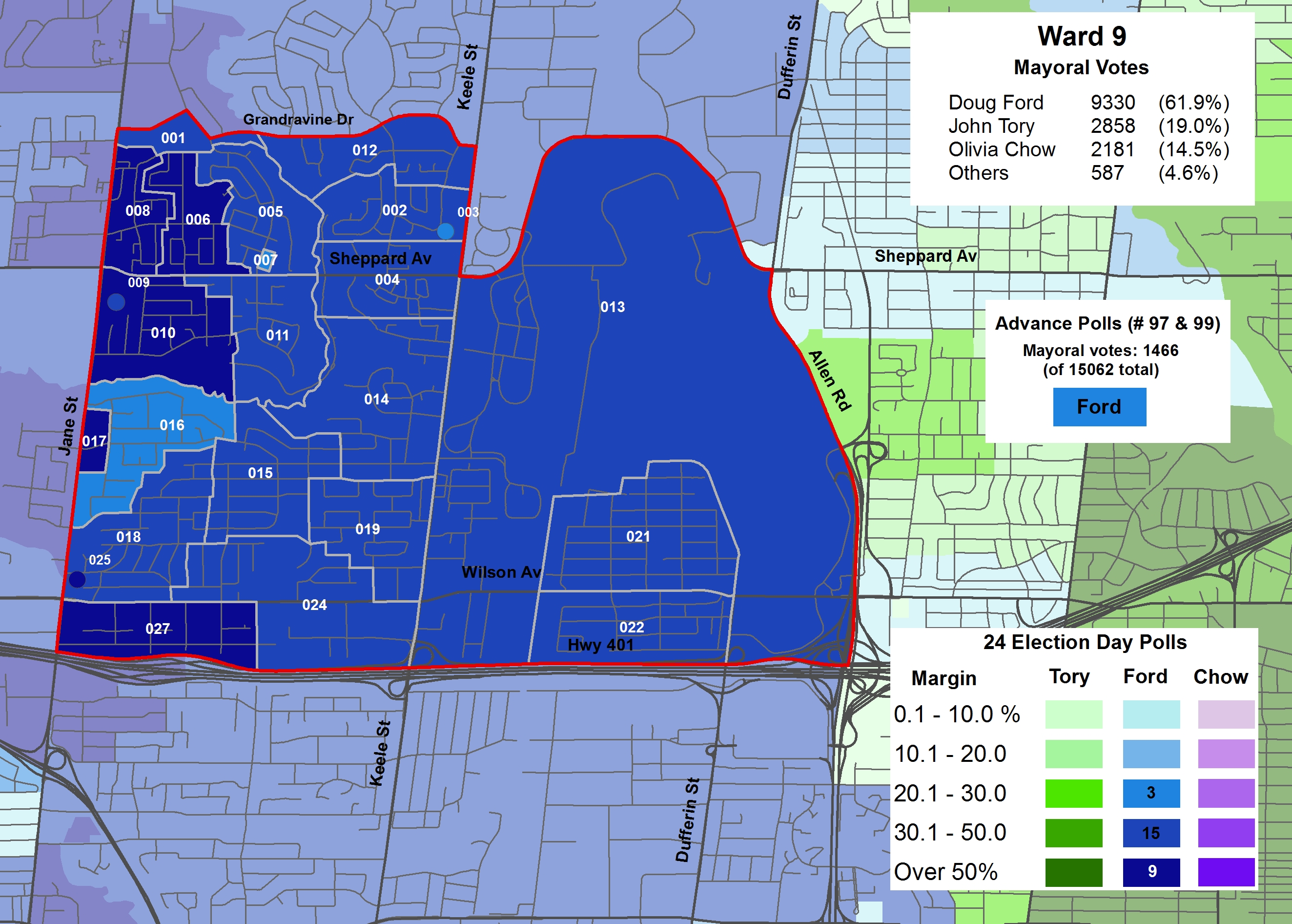 Doug Ford won Ward 9 by a huge margin. Ford took 61.9% of the vote and came first in every poll, while John Tory was preferred by only 19.0% of the electorate; Olivia Chow only got 14.5% of the vote.