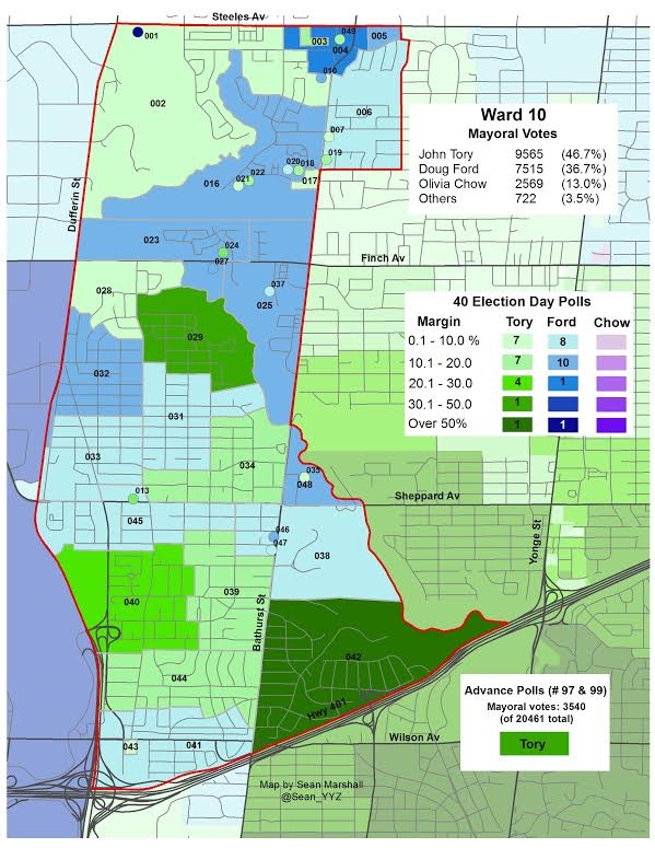 Ward 10 is somewhat wealthier than Ward 9; it includes the affluent Armour Heights neighbourhood. Ward 10 has a large Jewish population, and it has hosts Russian-Canadian and Filipino-Canadian communities (the two largest immigrant populations in the ward). In Ward 10, John Tory came first with 46.7% of the votes (Ford got 36.7% and Chow 13.0%). Tory did best in Armour Heights, while Ford did best in areas with higher proportions of immigrants and lower incomes, especially in the high-rise residential towers at Bathurst and Steeles. The only major surprise is that despite charges of the Fords’ anti-Semitism, Doug Ford came in first in several polls located in Jewish seniors’ homes.