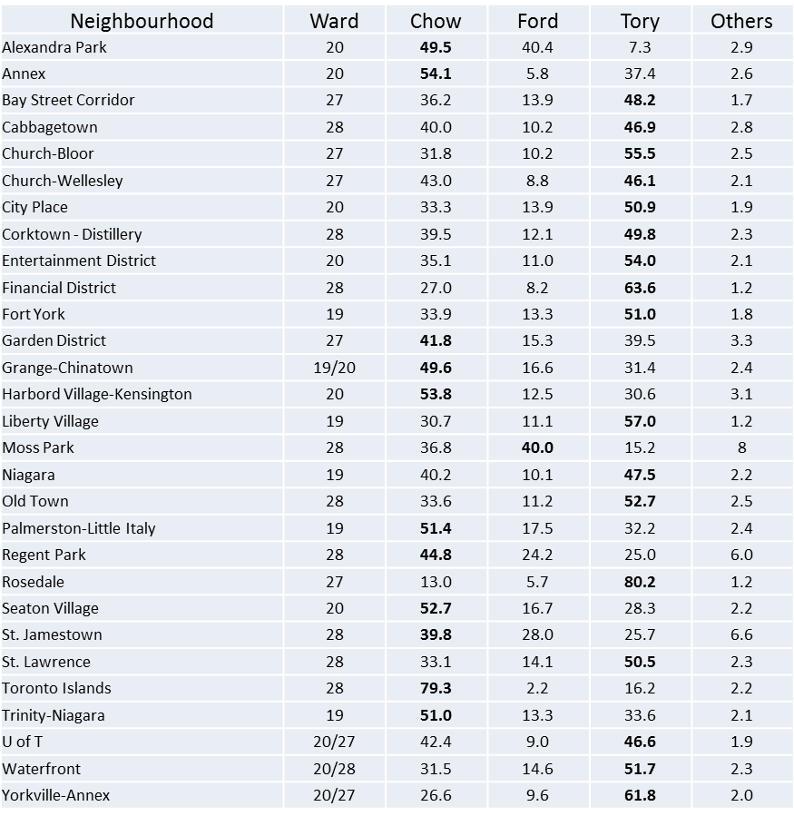 The map at the top of this article illustrates each poll’s first choice for mayor, without gradients based on the margin of the win. What can clearly be seen is that the older, more established neighbourhoods (with the exception of Rosedale and Yorkville) voted for Chow. The new condominium neighbourhoods voted for Tory. Doug Ford won a few polls – Moss Park and several other TCHC housing properties, but managed only to get 12.6% of the vote in these four wards.