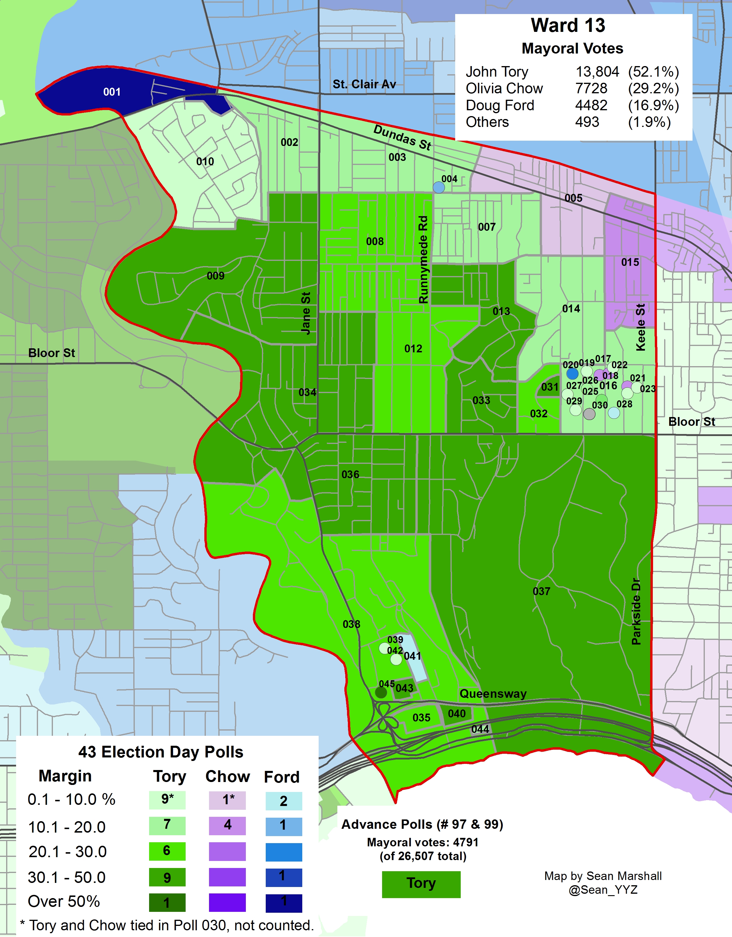 Tory won most polls in Ward 13, doing especially well in Baby Point and parts of Swansea and High Park. Olivia Chow won two polls closest to the Keele/Dundas intersection, the heart of the gentrifying Toronto Junction neighbourhood. The high-rise apartment cluster near Keele and Bloor was mixed; Tory, Chow and Ford won a few polls. Doug Ford won two TCHC polls: 001 (where he got 71% of the vote) and Poll 020, as well as a poll containing two older condo towers in Swansea (Poll 041) and a private rental in High Park (Poll 028).