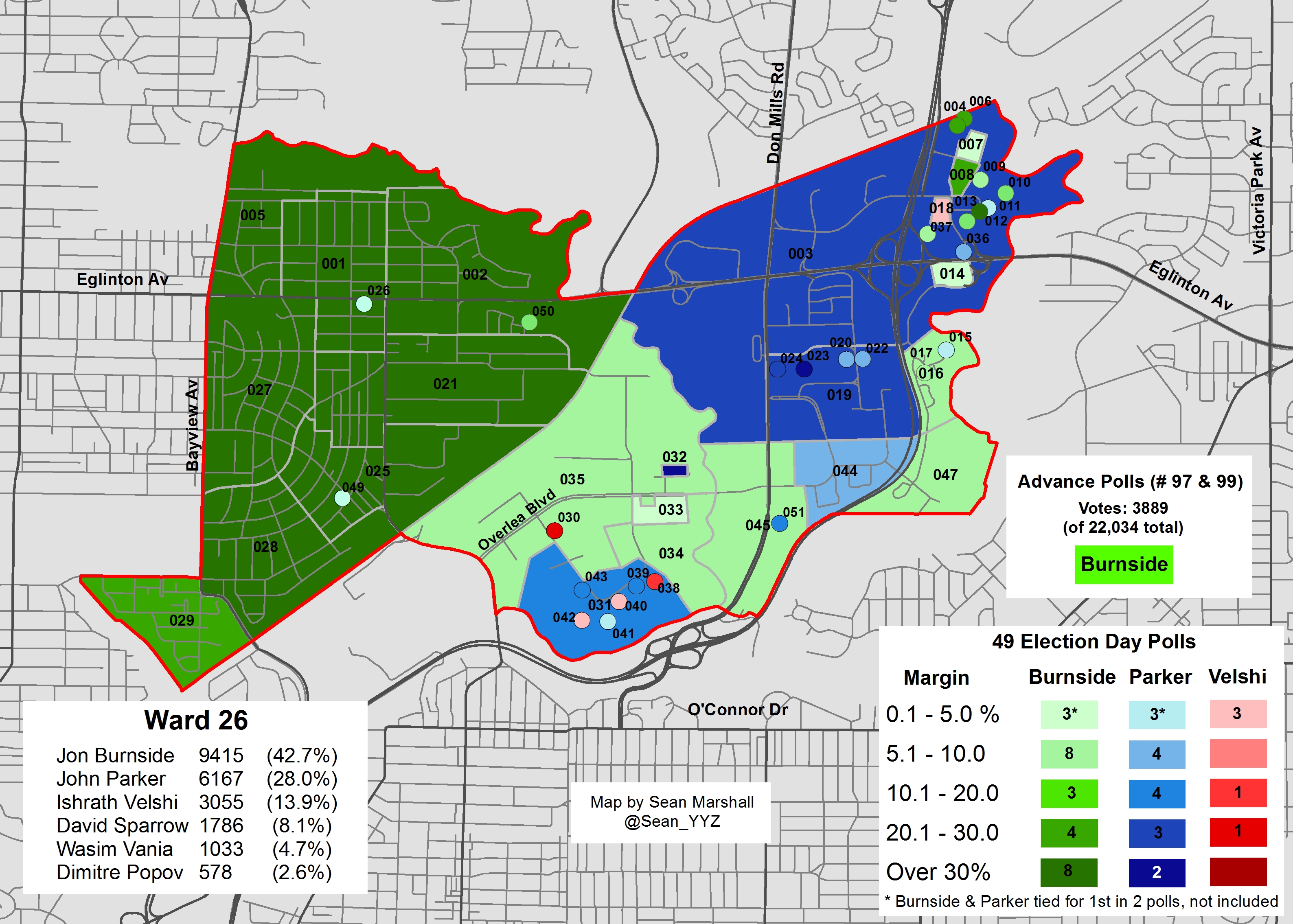 Leaside residents voted enthusiastically for both Tory and his pick for the ward. The Concorde Place/Wynford condo polls also mostly picked Burnside as well; Parker’s support mostly limited to polls in Flemingdon and Thorncliffe Parks. Ishrath Velshi, Parker’s former executive assistant (later Councillor Denzil Minnan-Wong’s EA) came in a distant third place, winning only 5 polls.