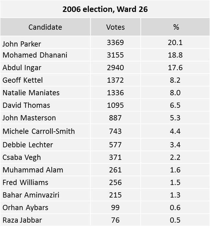Parker, a Progressive Conservative MPP in Mike Harris’ government, came in first place in the 2006 election in a crowded race of 15 candidates. That year, Parker won by only 214 votes over second-place Mohamed Dhanani; Parker took only 20.1% of the vote.