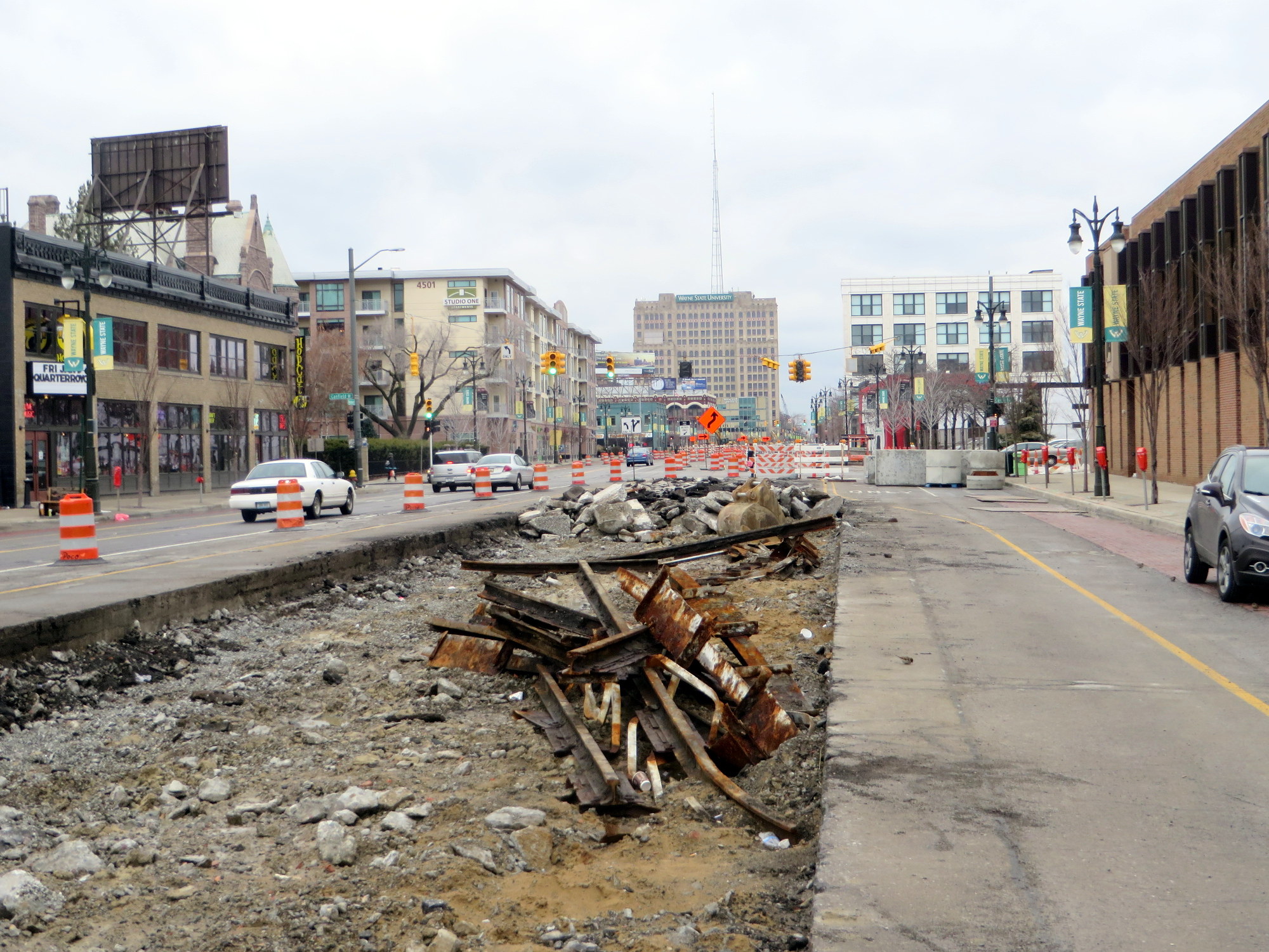 Former DSR tracks, last used in 1956, are removed as construction progresses on the M-1 streetcar, January 4, 2015