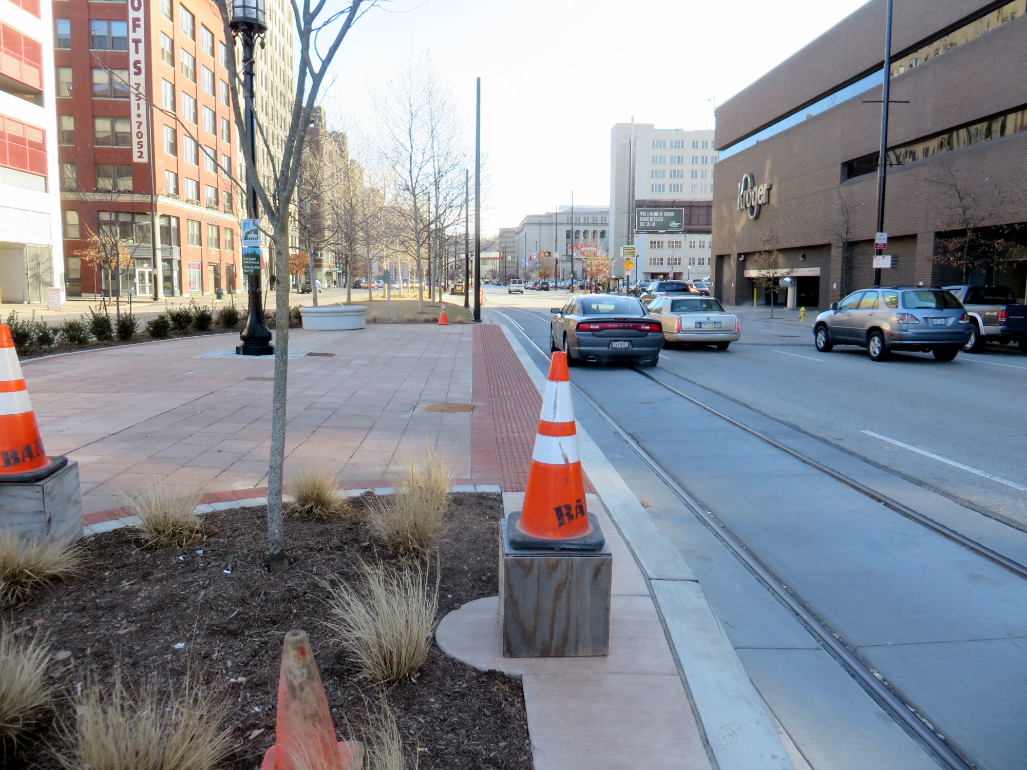 Central Boulevard, where newly laid streetcar tracks sit above the abandoned Cincinnati Subway