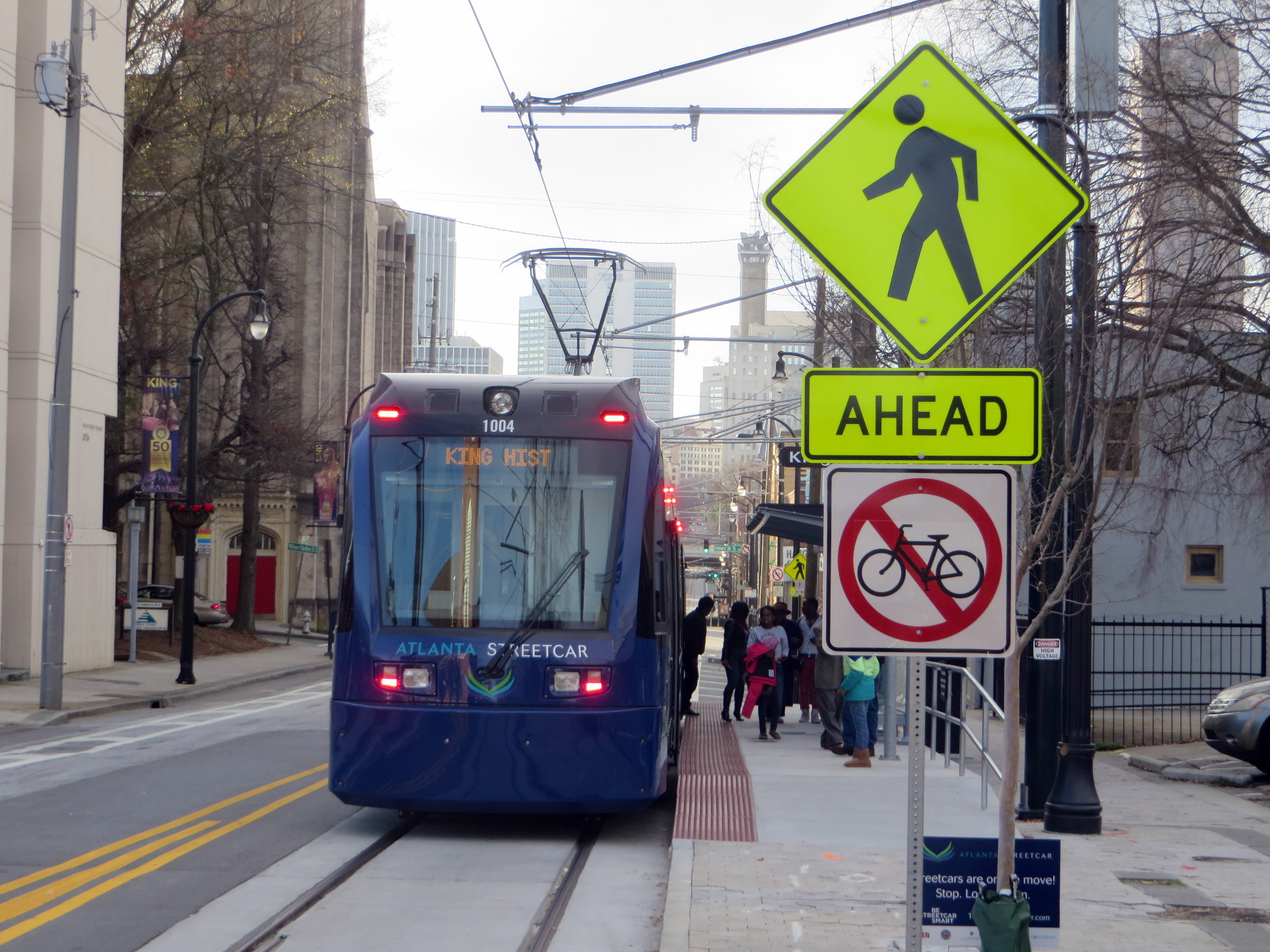The Atlanta Streetcar in mixed traffic. Note that cyclists are banned from the streetcar’s route.