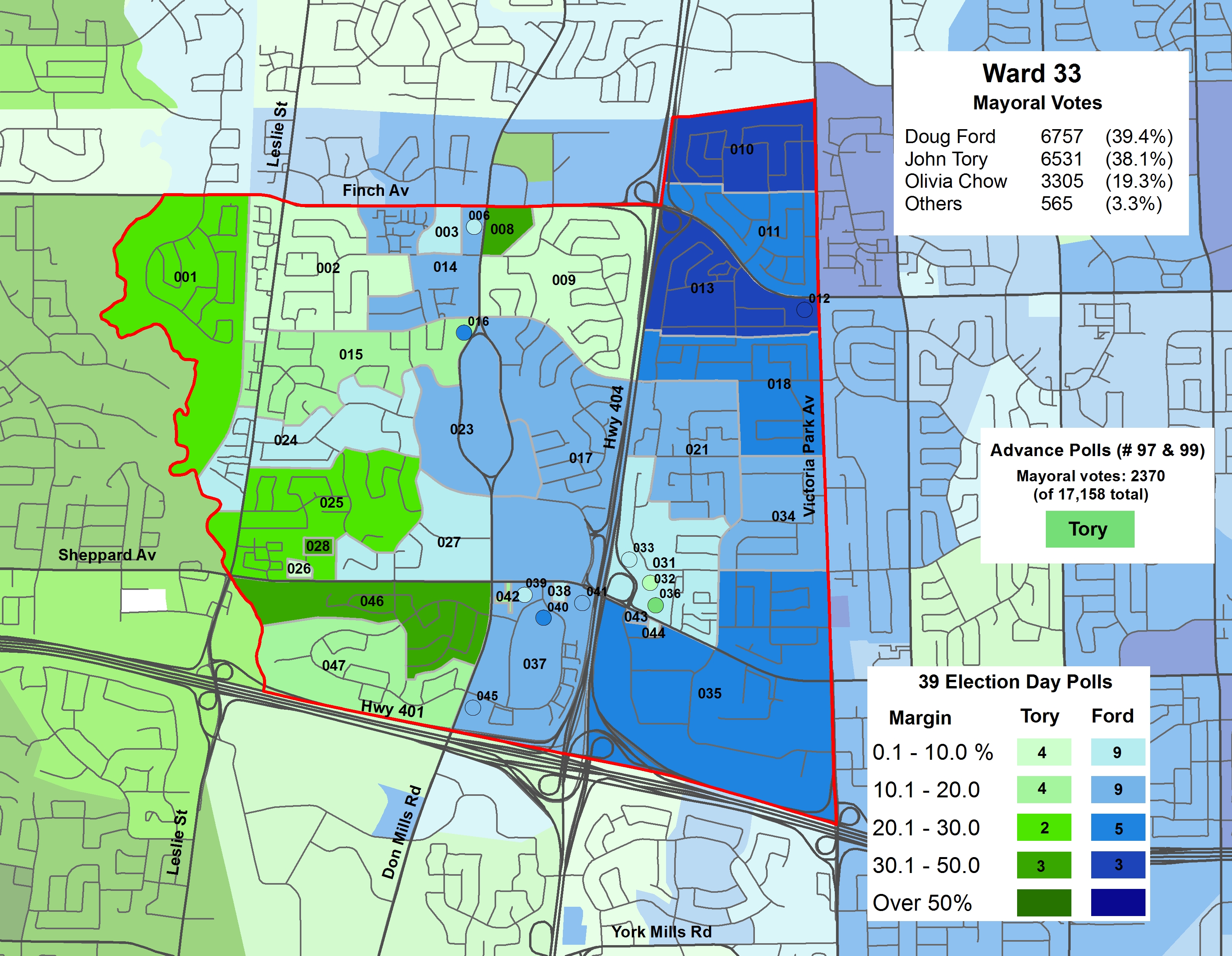 In Ward 33, Doug Ford won a plurality of the votes (39.4%), but by a very small margin; only 226 votes separated Ford and John Tory (who took 38.1% of the vote) in that ward. As in nearly all suburban wards, Olivia Chow came in a distant third race, netting only 19.3% of the vote there. Tory came first in most polls on the west side of the ward, closer to Yonge Street (Tory came in a comfortable first place in neighbouring Ward 24), while Ford did better in polls to the east, closer to Victoria Park Avenue and Scarborough. Condos, such as polls 008, 036, 038, and 042, picked Tory, while rental highrises went for Ford, as did single-family housing tracts east of Highway 404. Ford’s support for extending the Sheppard Subway (a money pit in this author’s opinion) was likely one factor that explains the geographic split.