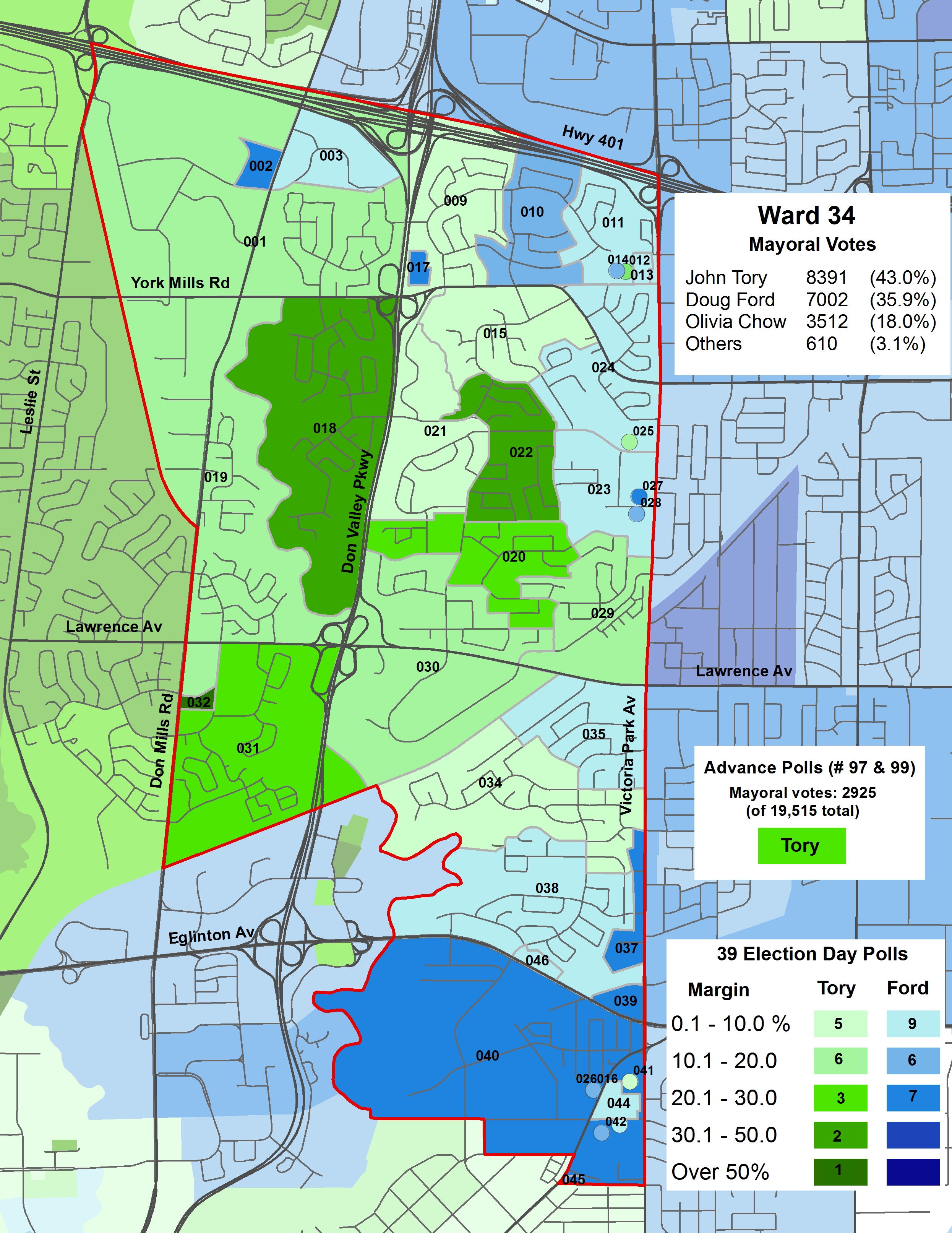 Ward 34 is located south of Highway 401 and takes in the eastern half of Don Mills, as well as Parkwoods Village (near York Mills/Victoria Park) and Victoria Village (the area located south of Lawrence Avenue, east of the Don Valley Parkway). John Tory came in first place here, netting 43% of the mayoral vote, and 17 of the 39 election day polls, as well as the advance vote. Doug Ford actually came in first place in more polls, but many of these were located in high-rise buildings with smaller populations. Olivia Chow took only 18% of the vote in Ward 34. Doug Ford’s support was strongest in the southeastern corner of the ward, near O’Connor Avenue, in a relatively low-income neighbourhood.