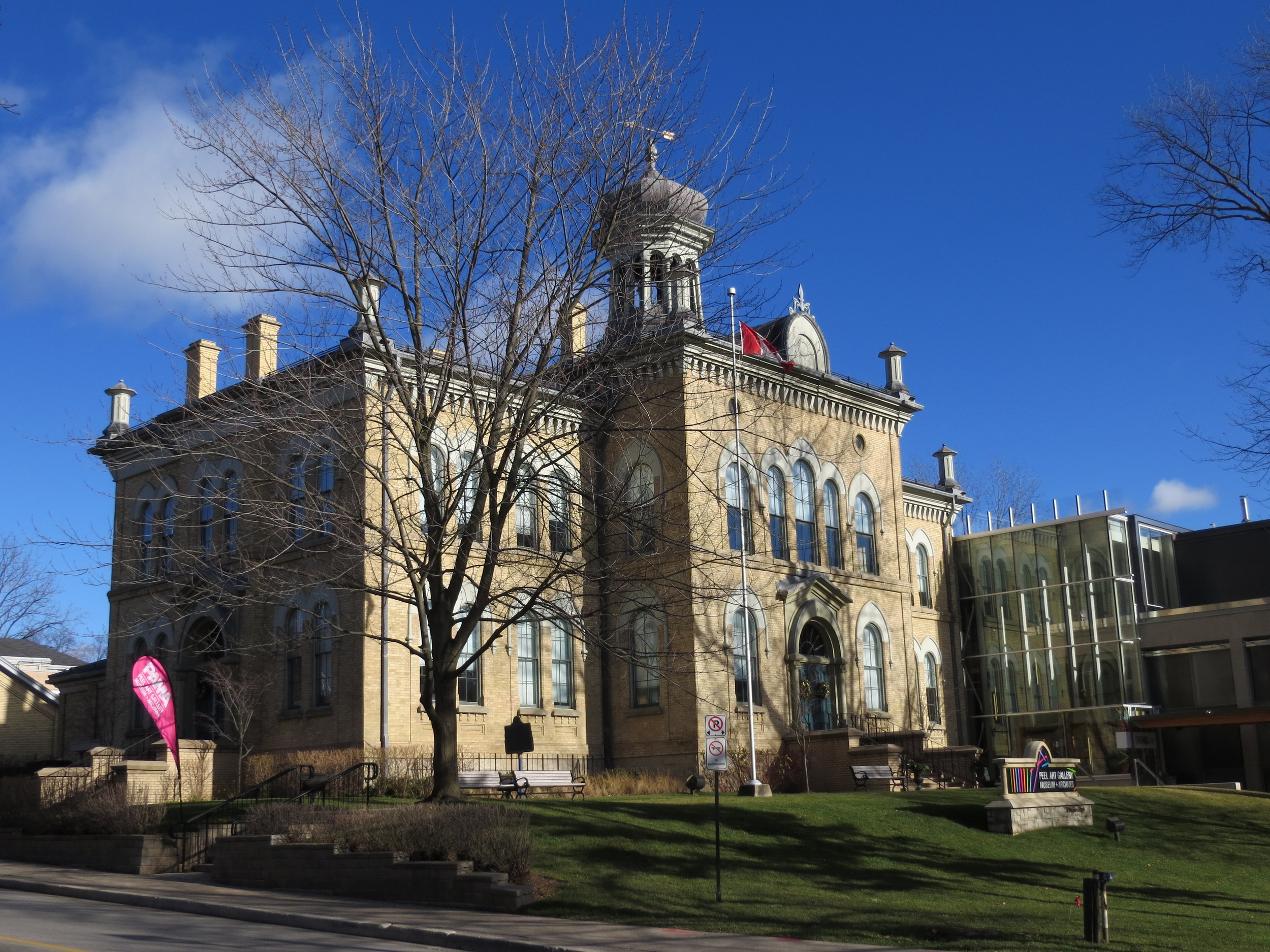 Apart from the greenhouses, which disappeared by 1980, and the hospital, which moved across town in 2008, all of the buildings I described are still standing (or in the case of Dominion Skate, partially standing). Downtown Brampton is blessed by its collection of historic buildings; many of these structures are lovingly preserved. The old Thomas Fuller designed Dominion Building on Main Street, which later became a police station and then a pub, was renovated and now has a Starbucks. GO Transit and VIA Rail still use the 1907 Grand Trunk Station. The Hewetson Shoe Factory is now a loft commercial space, and the old county buildings were preserved and now house the innovative Peel Art Gallery, Museum and Archives.