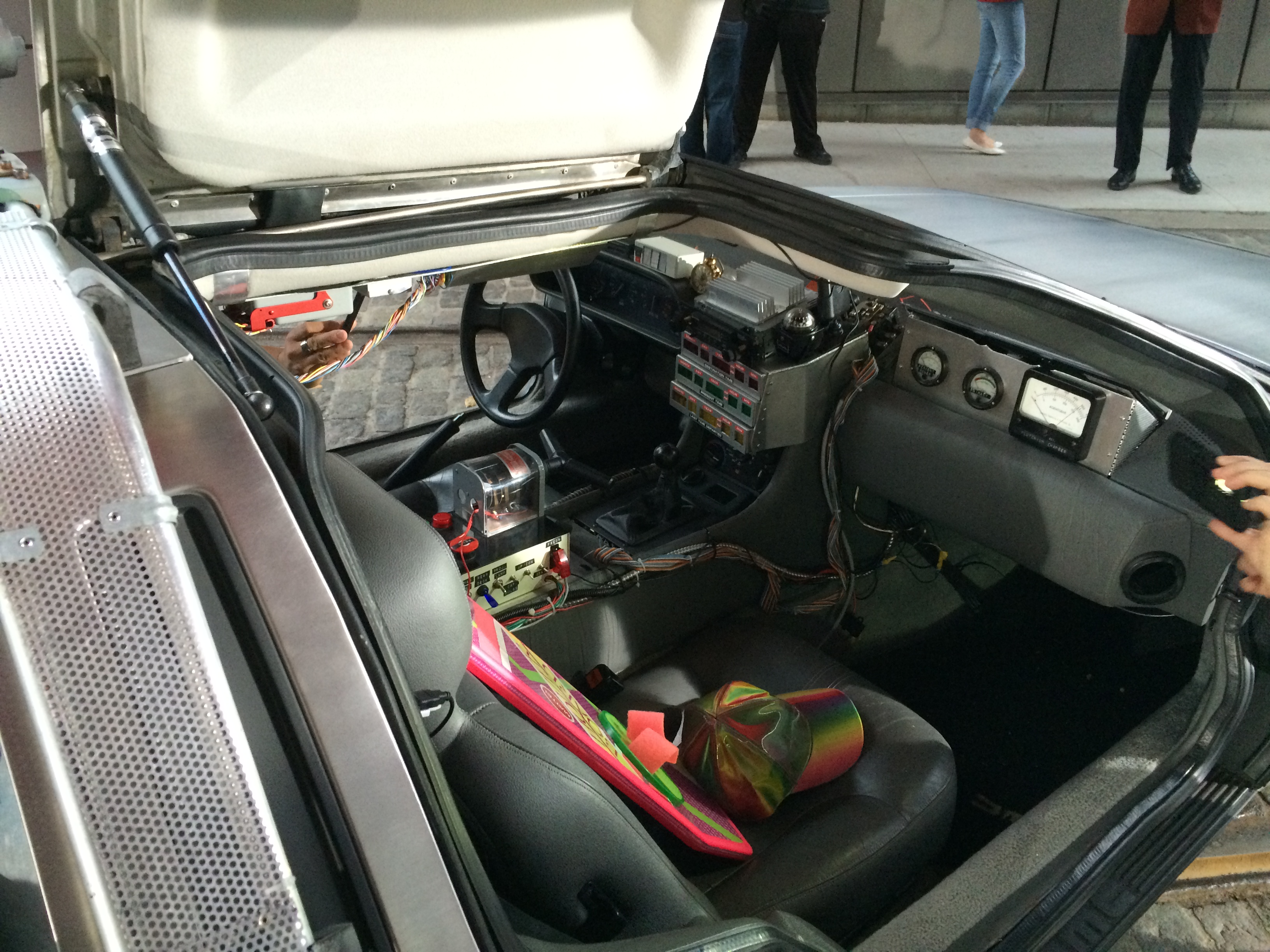 The joys of living close enough to work to walk there includes passing by the Rogers/CityTV building at Dundas Square. where a DeLorean, fitted out like the one used in the film trilogy, was on display. In the franchise’s “history,” October 21, 2015 was the day Doc Brown and Marty McFly arrived in a time machine from 1985 in an attempt to save Marty’s future children from trouble.