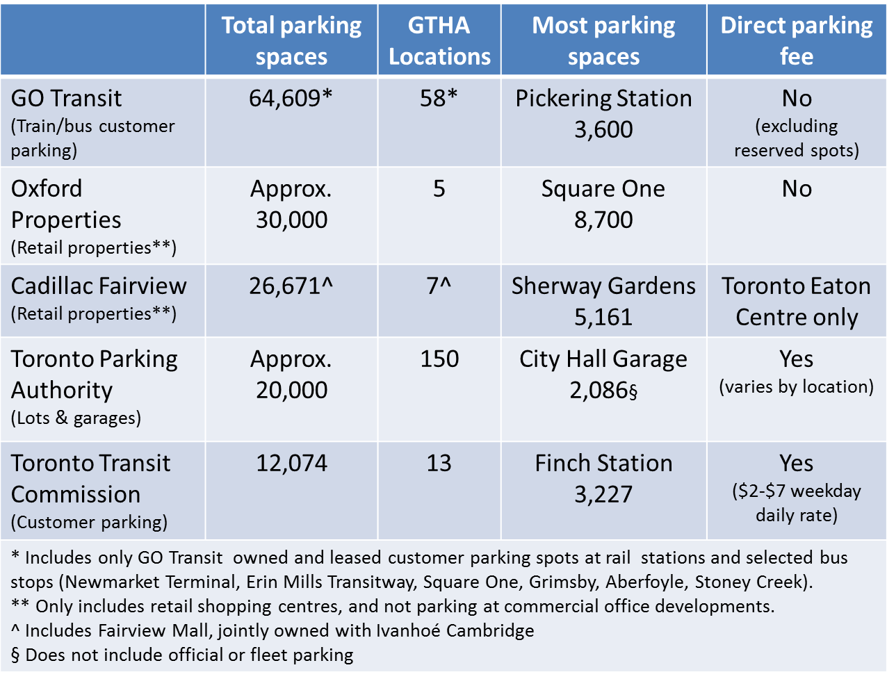 The Toronto Parking Authority, the largest municipal parking operator in North America, operates 20,000 off-street parking spots in lots and garages across the City of Toronto. (The TPA is also responsible for 17,500 metered on-street spots.) Oxford Properties Group owns approximately 30,000 spots at five GTHA malls (Square One is the largest, with 8,700 spots), while Cadillac Fairview owns 26,671 spots at 7 GTHA malls. The TTC has parking facilities at 13 stations; Finch, with 3,227 spots, is the TTC’s largest, though Finch Station’s parking lots are within a hydro field.