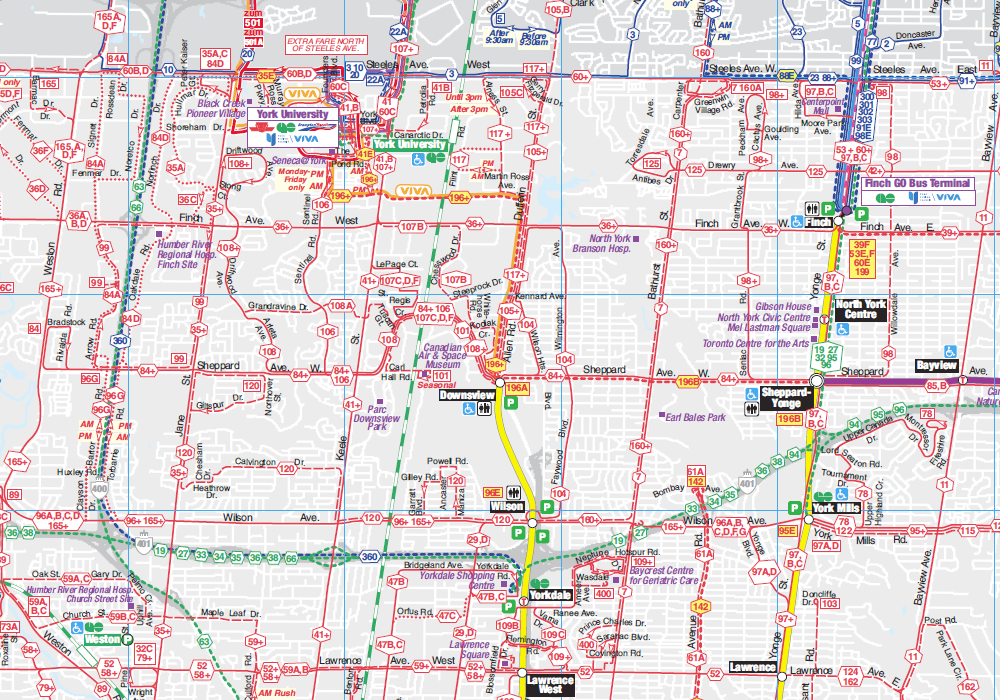 One part of the over-simplification is that they don’t even identify every street that buses operate on. For example, look at the triangle on route 104 just east of Downsview Station. It isn’t indicated where the 35A accesses Jane St. north of Finch. Another is how route 120 travels from Calvington to Jane St. north of Wilson, or how the 97C loops SW of Yonge/Steeles. Are these just drafting errors, or intentional omissions?