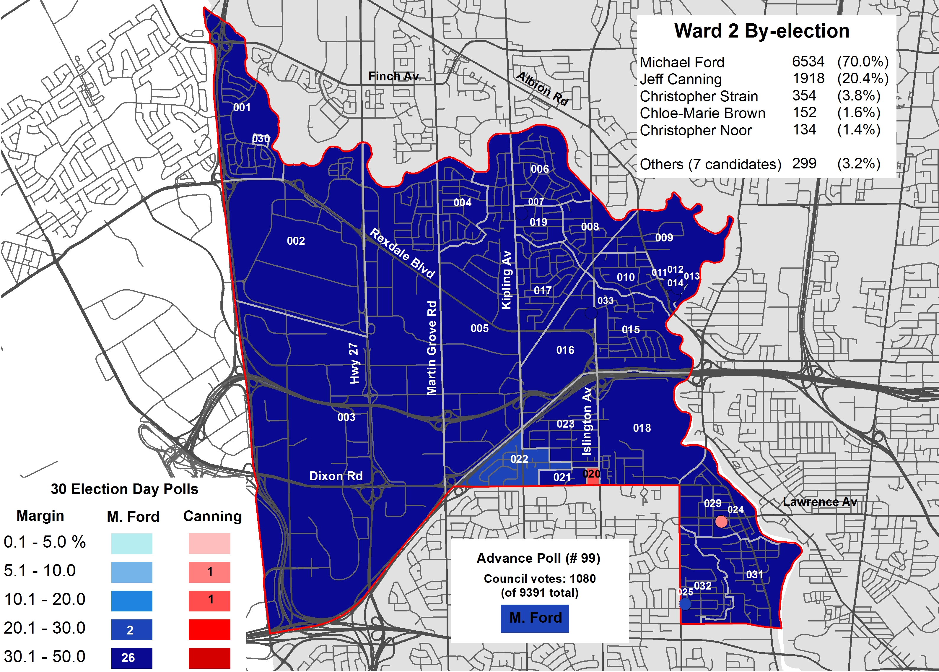 Michael Ford came in first place in all by two polls by wide margins, as shown in the map above. Only two polls, 020 and 024, chose Justin Canning. Poll 020 represents two condo towers on Islington Avenue at Dixon Road, while Poll 024 represents a seniors’ residence on Lawrence Avenue. Both polls voted for Rob Ford for council in 2014, but for John Tory for mayor over Doug Ford.