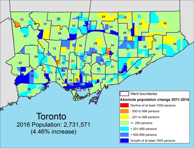 But more interesting is the map showing absolute population increases or decreases between 2011 and 2016. It better illustrates areas of high population growth and neighbourhoods with population decline. The inner suburbs, especially parts of Scarborough and North York, clearly show slight a population decline compared to the high-growth areas described above.