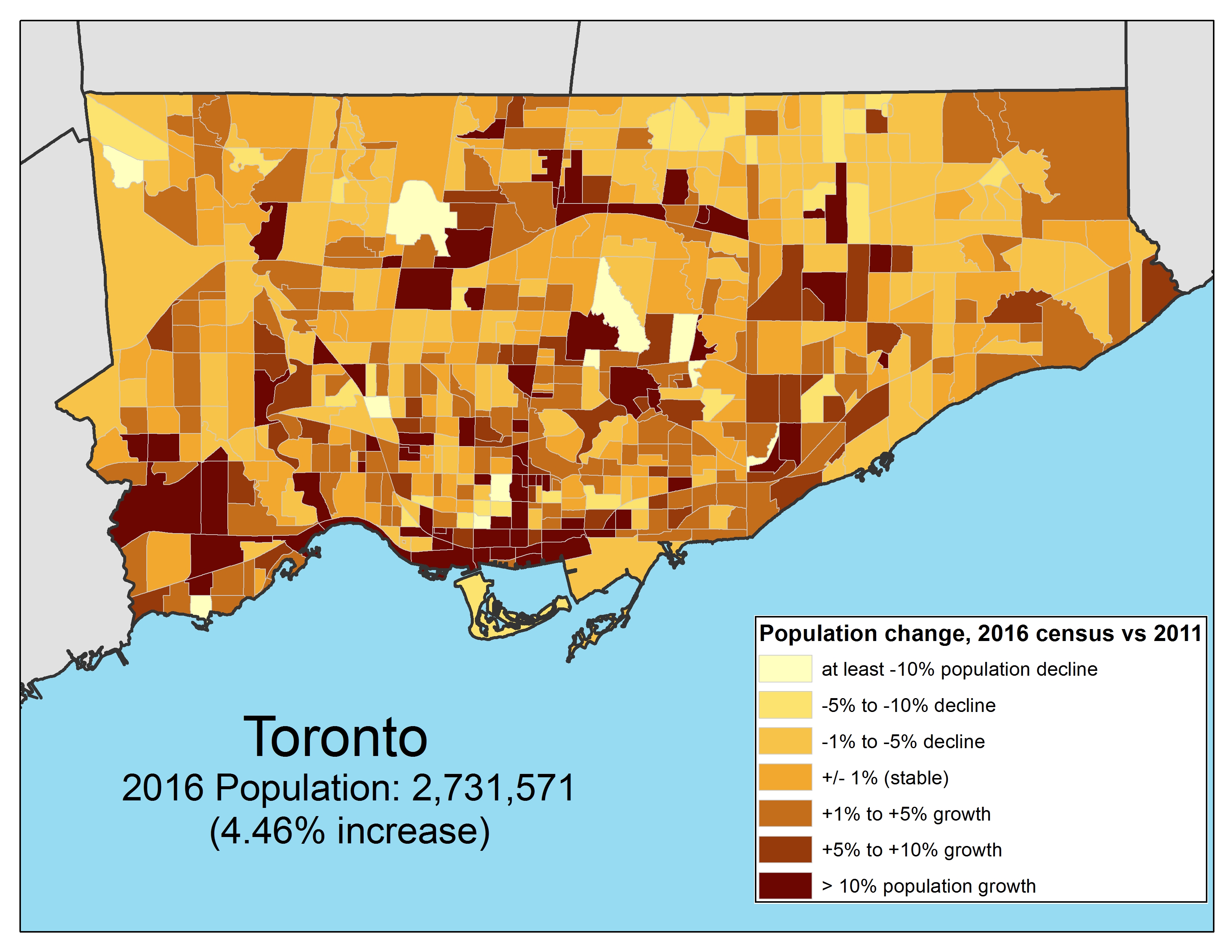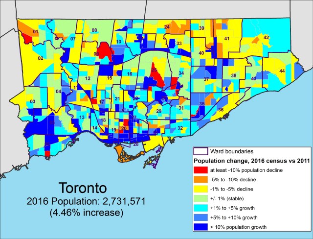 Population change between 2011 and 2016 by percentage by census tract, Toronto