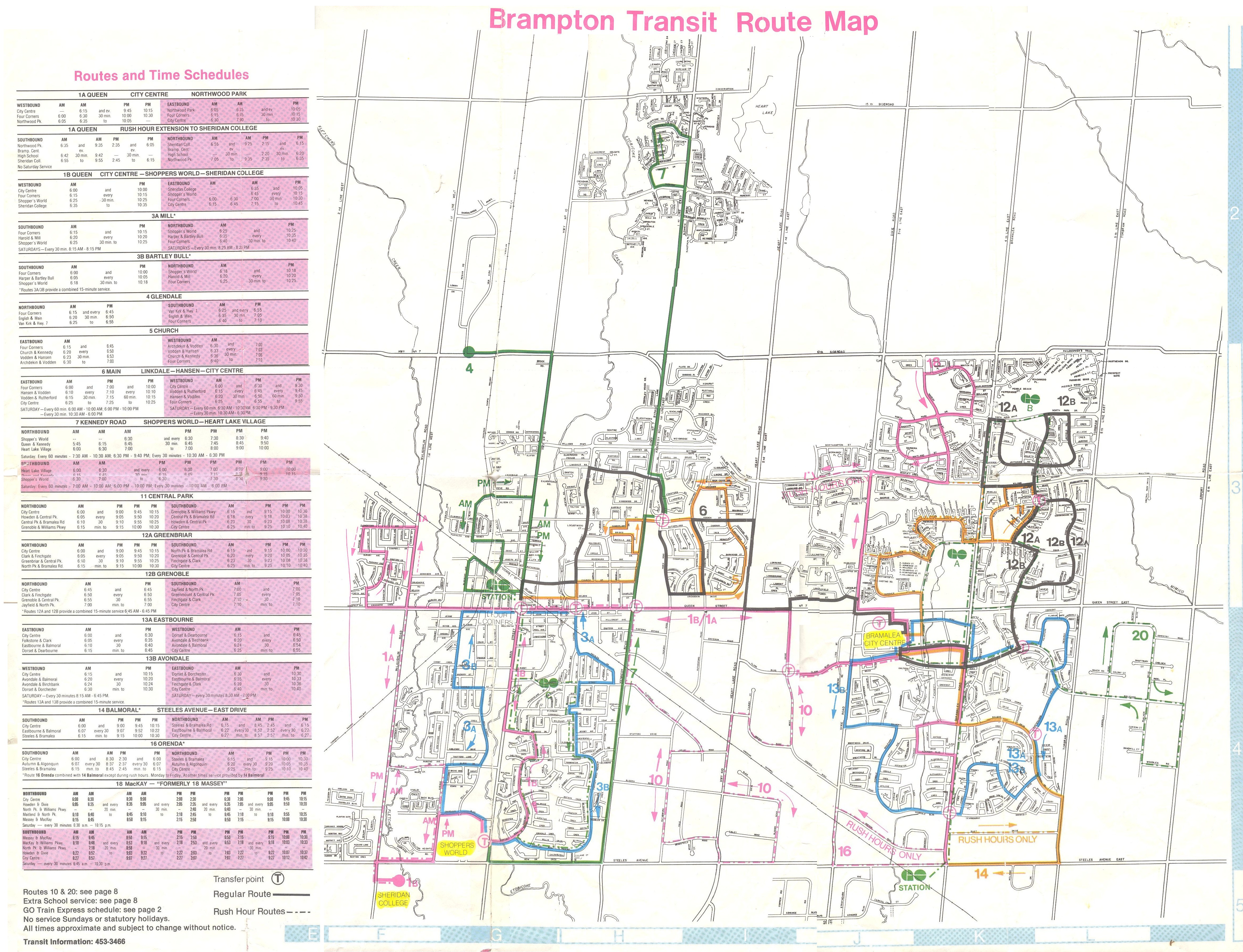 Brampton Transit began operations in 1976 after the old Town of Brampton’s local bus service was amalgamated with the dial-a-bus service operated in Bramalea. (Brampton amalgamated with most of Chinguacousy Township in 1974, including Bramalea.) In 1980, Brampton Transit operated 14 routes, serving a community of just under 150,000 people. Buses operated no later than 9:00 or 10:00 PM, Mondays through Saturdays, and many routes operated with long, meandering loops. Apart from GO Transit, there were no connections to nearby communities.