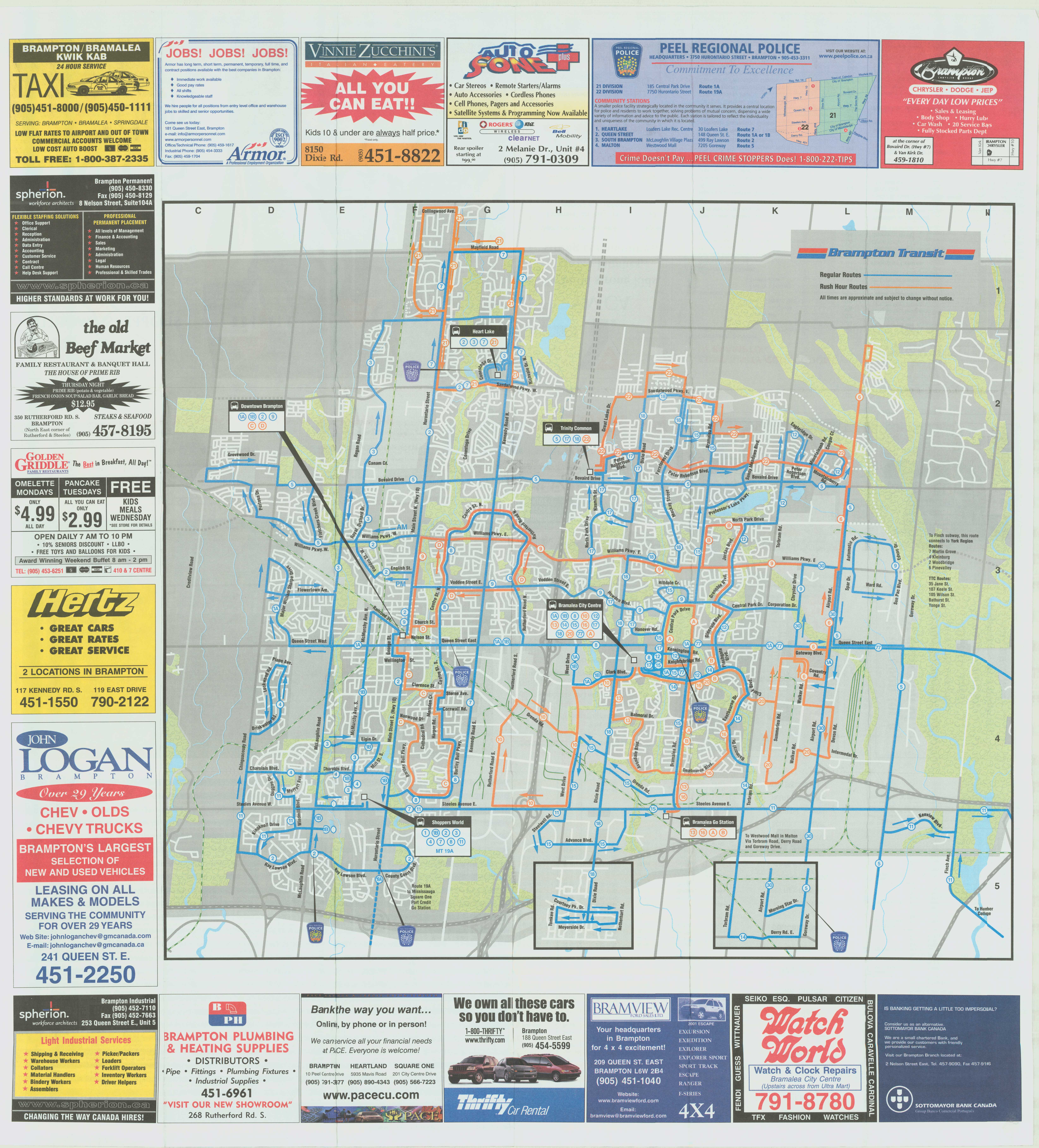 Brampton Transit Maps published in the 1990s and early 2000s were printed on newsprint, and used only a two-colour scheme: blue for regular routes, and orange for rush-hour routes. Service to new subdivisions was often provided by way of long one-way loops, which is an inexpensive way of serving new areas, but are inconvenient and slow for potential riders.