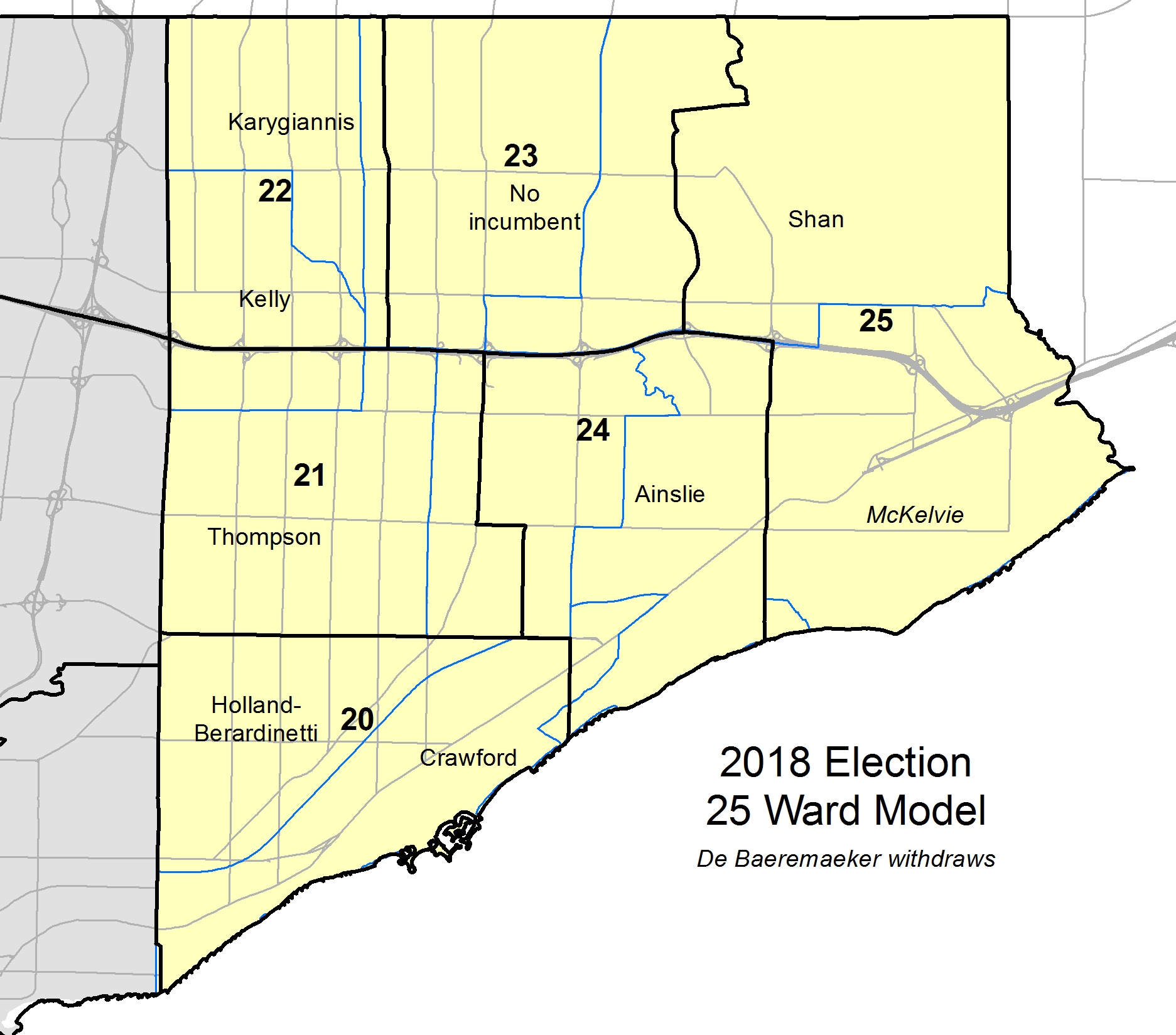 I previously mapped the results in Ward 22, where Jim Karygiannis defeated Norm Kelly, Ward 23, where conservative businesswoman Cynthia Lai won, and Ward 25, where Jennifer McKelvie defeated incumbent Neethan Shan.