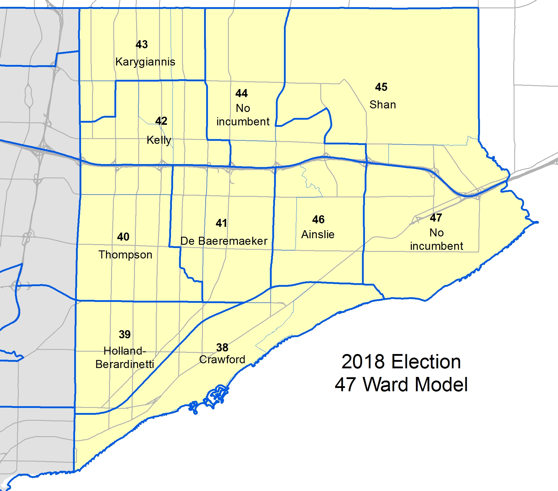 With the new 47 ward model approved by city council for the 2018 election, Scarborough was allocated the same number of wards, though boundaries shifted to reflect changes in population. Two of the new wards – 44 and 47 – had no incumbent running, opening those wards up to new voices.