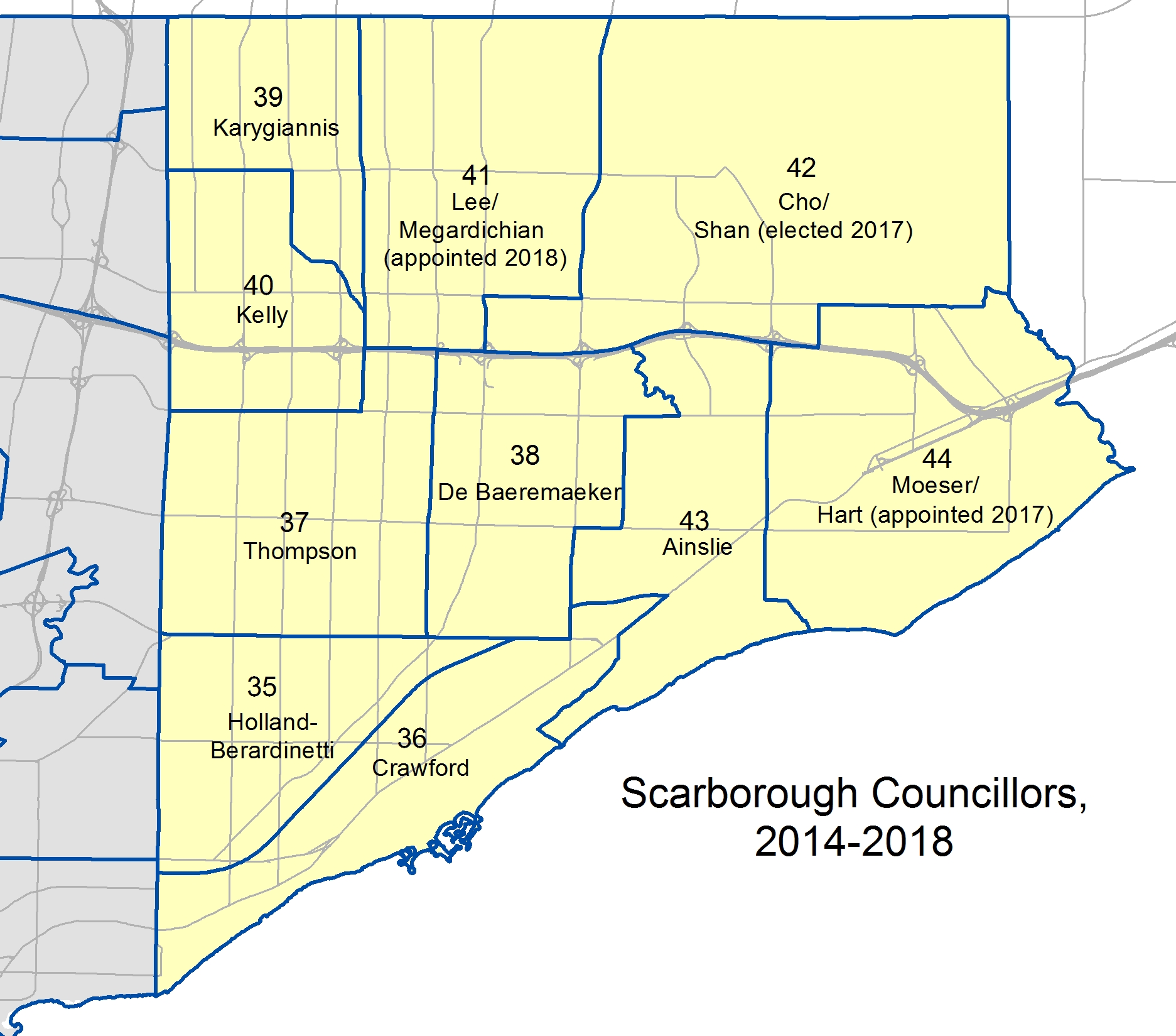 In 2014, Scarborough elected ten city councillors. Since that election, one councillor, Ron Moeser, died in office, while two others, Raymond Cho and Chin Lee, resigned to run for provincial office. Cho, representing the Ontario PCs, was successful, while Lee, running for the Liberals, was not. Neethan Shan was elected in Ward 42 in a by-election to fill Cho’s seat. Jim Hart was appointed in Ward 44 by council after Moeser’s death, and Miganoush Megardichian was appointed in Ward 41.