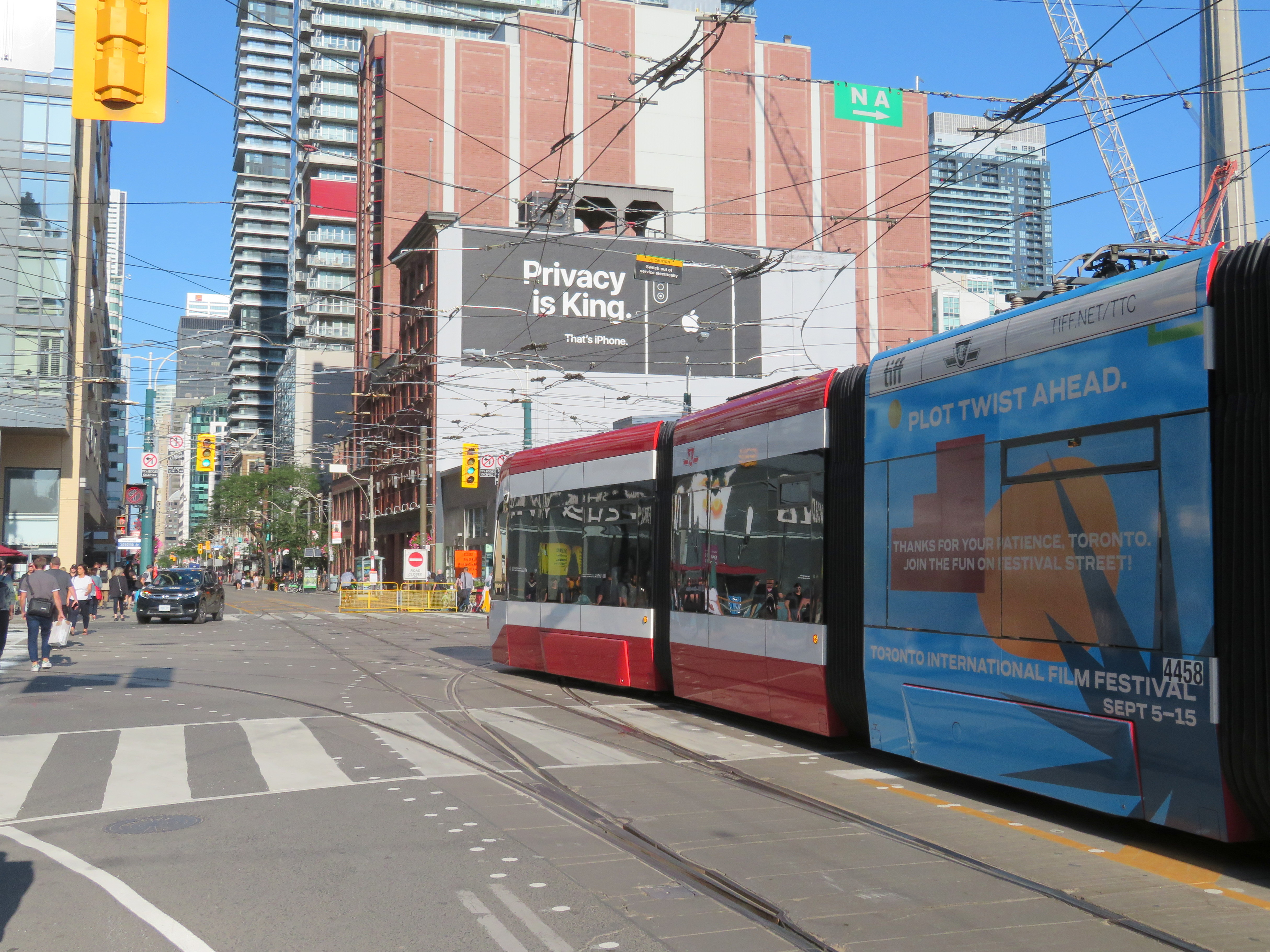 On Monday, streetcars were being diverted during the afternoon rush hour for a “Red Carpet Event” at the Princess of Wales Theatre. I thought that this could have made a great streetcar reservation, as done in 2013. Instead, pedestrians were directed to the south sidewalk, and there, diverted to get around fans looking for a glimpse of Meryl Streep.