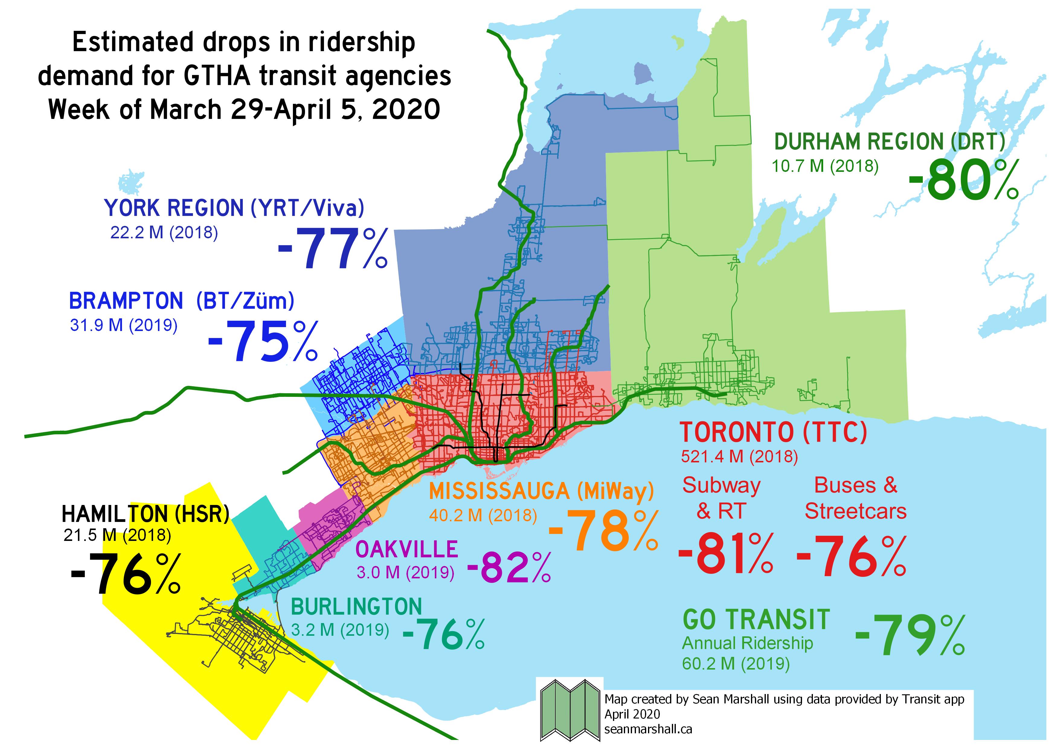 Map depicting estimated drops in transit demand for GTHA transit agencies compared to expected use for week of March 29 to April 5, 2020. Data from Transit app.