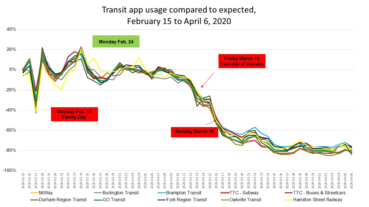 Note how the actual Transit app usage dropped by over 40% for every transit agency on Monday, February 17, which was Family Day, a provincial holiday in Ontario. Most transit services were operating on a weekend or holiday service, while students and many workers did not take transit. This was likely compared with normal Mondays, hence the one-day drop.