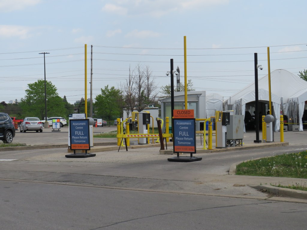 Across the street from Woodbine Centre, in another parking lot, there is another sign of the times: an overflow lot for Humber College has been transformed into a drive-through COVID-19 assessment centre. At 12:30 on Monday, May 25, the centre, which is normally open daily from 10:00 AM to 6:00 PM, was already full, and not accepting any more patients who were looking to be tested.