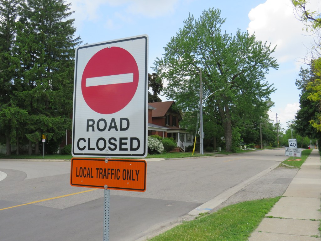 While I was in Brampton recently, I noticed a more effective approach. On Scott Street, just east of the city’s downtown core, a narrow bridge was closed to motor traffic in order to provide a quiet and safe crossing of Etobicoke Creek to connect two sections of the Etobicoke Creek Trail. Instead of moveable pylons, rigid plastic bollards were bolted to the roadway, with a compliant “road closed” sign posted in the middle.