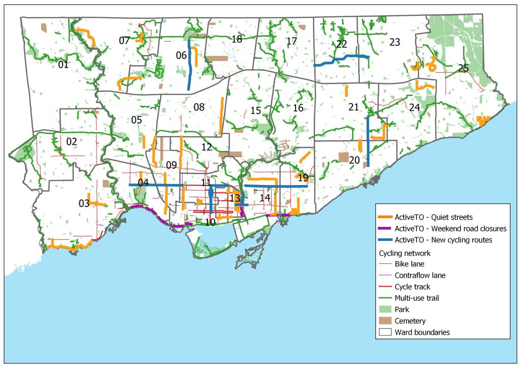 Map of ActiveTO Quiet Streets, weekend closures, and new cycling routes