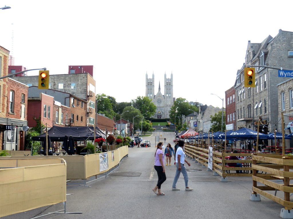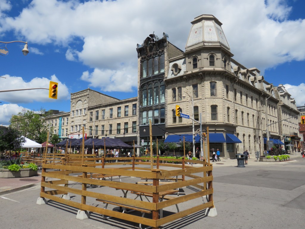 In Downtown Guelph, the intersection of Wyndham and Macdonell Streets was closed to allow restaurants, bars, and breweries to operate large open air dining areas, in what is called the Downtown Dining District. Unlike The Danforth, patio areas allocated to local businesses in Guelph are enclosed with fences or ropes, but the centre of the street is free to walk or bike through.