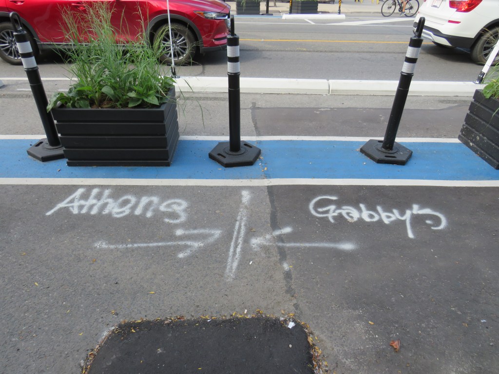 On Danforth Avenue, new interim bicycle lanes were installed between Broadview Avenue and Dawes Road, spanning three business improvement areas (Broadview Danforth, Greektown, and Danforth Mosaic). With the new bike lanes, dedicated spaces for restaurant patios were installed in the curb lanes. The new patios extended beyond restaurant storefronts, with spray-painted demarcations to mark each business’ territory. This gave businesses with limited or no indoor seating plenty of room to serve customers and recoup some of the lost business due to the pandemic.