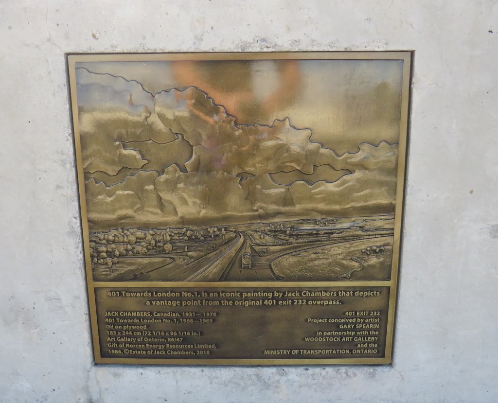 I was even more surprised to see an engraved version of the Jack Chambers painting embedded in the guardrail. When the Ministry of Transportation Ontario (MTO) rebuilt the overpass in 2017-2018, it thoughtfully included this nod to a local artist.