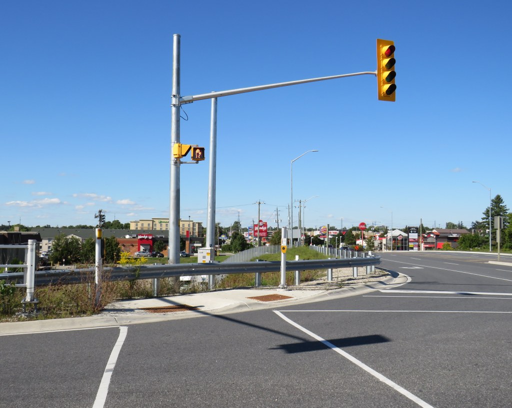 As I climbed over guardrails and navigated sidewalk-less embankments and road shoulders to capture the contemporary image of Jack Chambers’ painting, I was surprised by two things. The first were fully AODA-compliant crossing treatments at the highway ramps, despite there being no safe and marked way to get to those crosswalks.