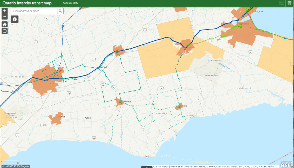 November 9, 2020: I made several updates to the interactive map, including the addition of PC Connect in Perth County, which launches next Monday. I mapped Port Hope’s transit connection to Cobourg, as suggested by one of the readers, and corrected a few minor errors.
