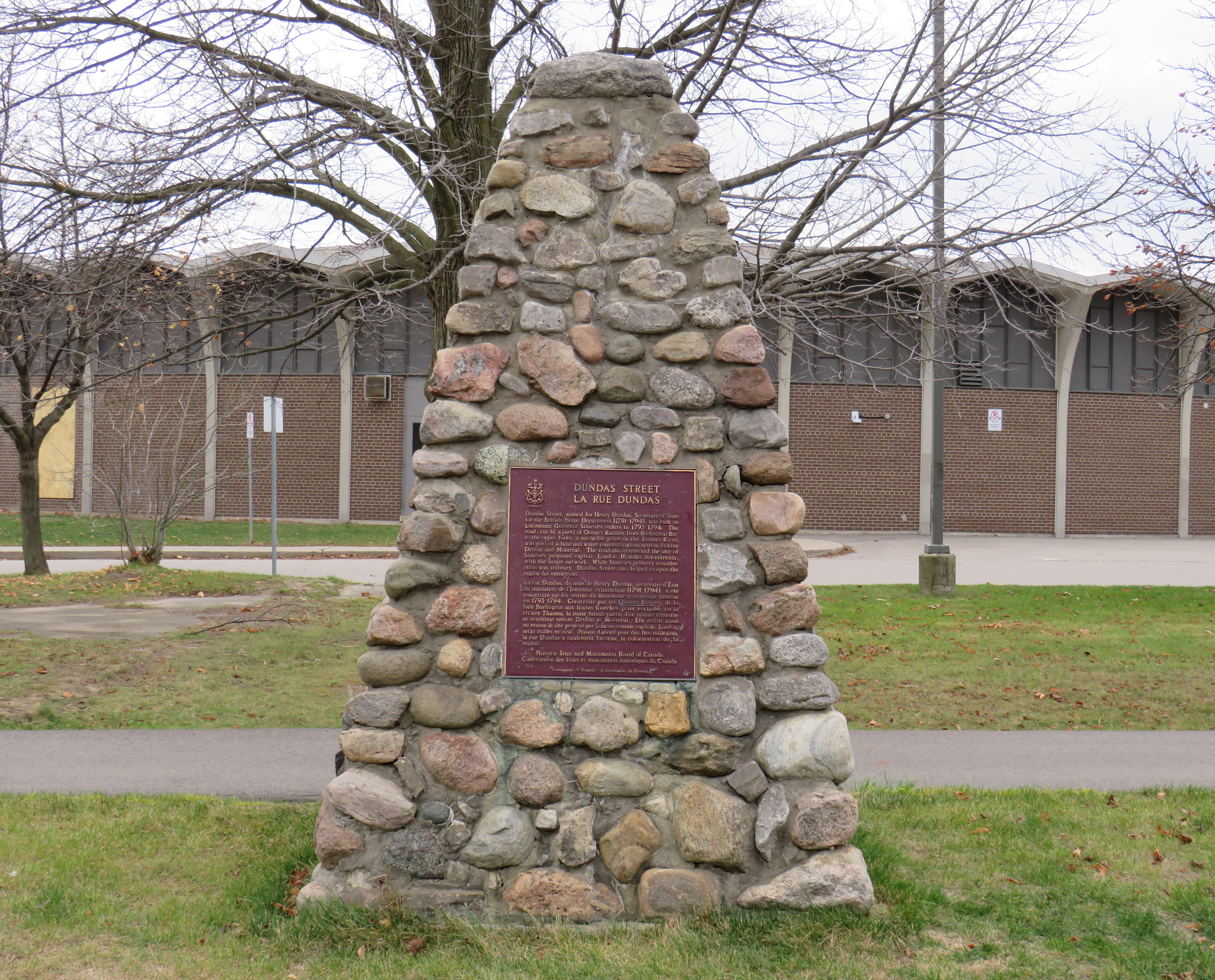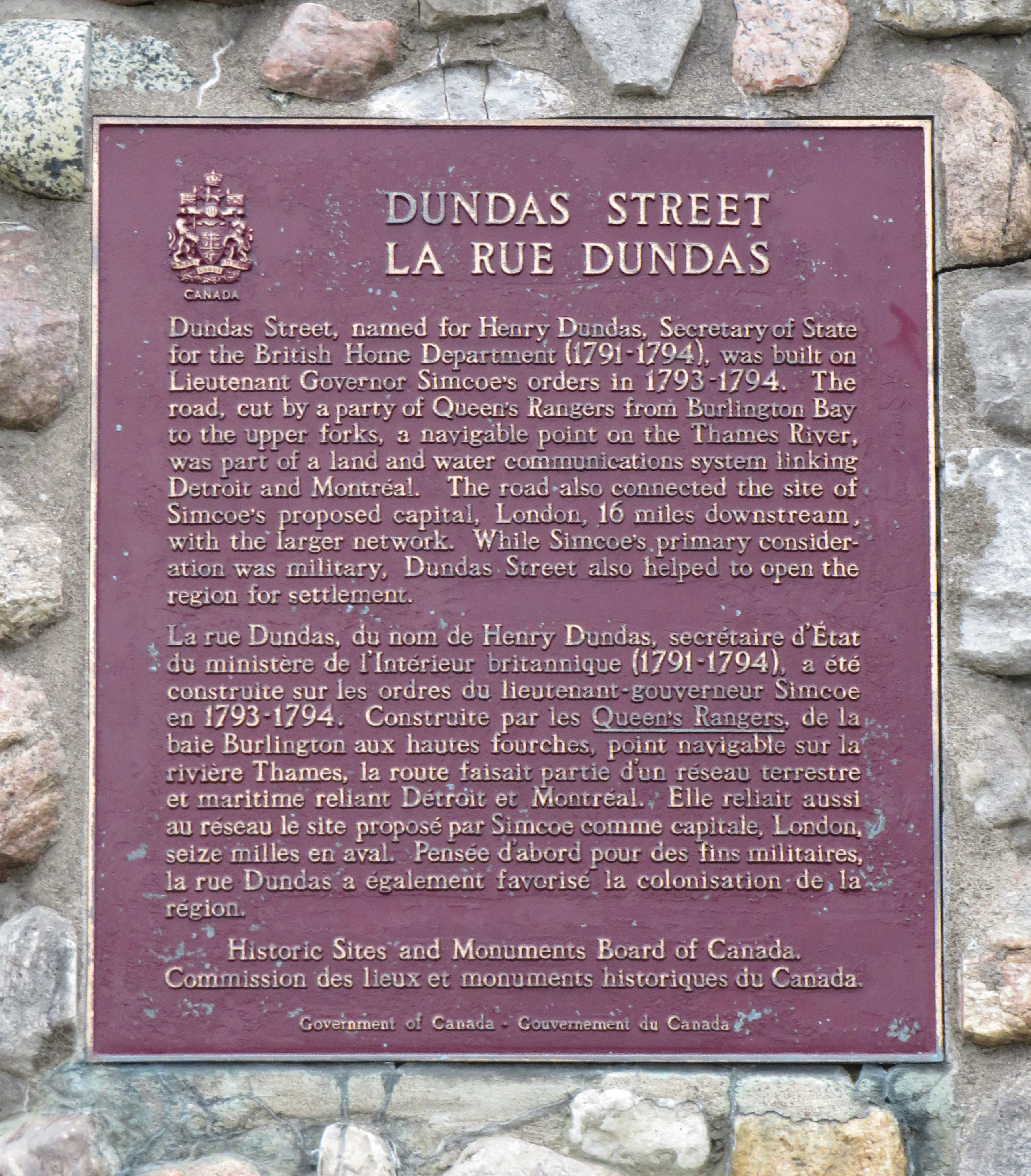 Dundas Street was established as a military supply route by order of John Graves Simcoe, the first British governor of Upper Canada. At first, it was surveyed and cleared in 1794 and 1795 between Cootes Paradise (at the very end of Lake Ontario, beyond Burlington Bay) and the Upper Forks of the Thames River, at what is now Woodstock. From there, small boats could be used to travel downriver to London and to Lake St. Clair. Though there were several Indigenous trails connecting Lake Ontario and the Thames River (the western part of Mohawk Road in Hamilton follows one such route), the new British colonial government favoured a straight, direct road.