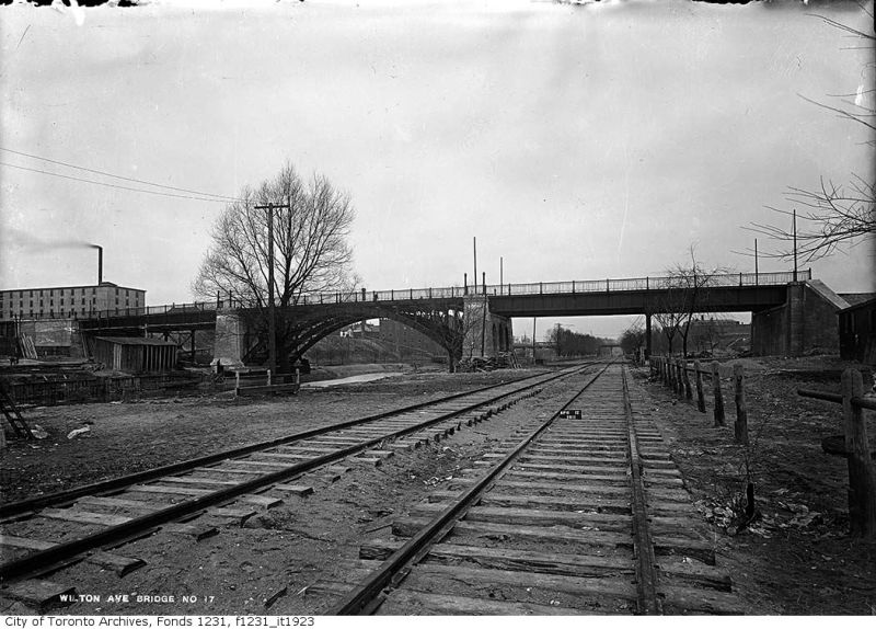 East of Yonge Street, Wilton Avenue was extended across the Don River in 1911, extending just east of Broadview Avenue, incorporating Elliot and Crawford Streets. Though the new bridge was built with streetcar tracks and overhead poles, through service did not begin until 1923, as part of a major TTC route restructuring.