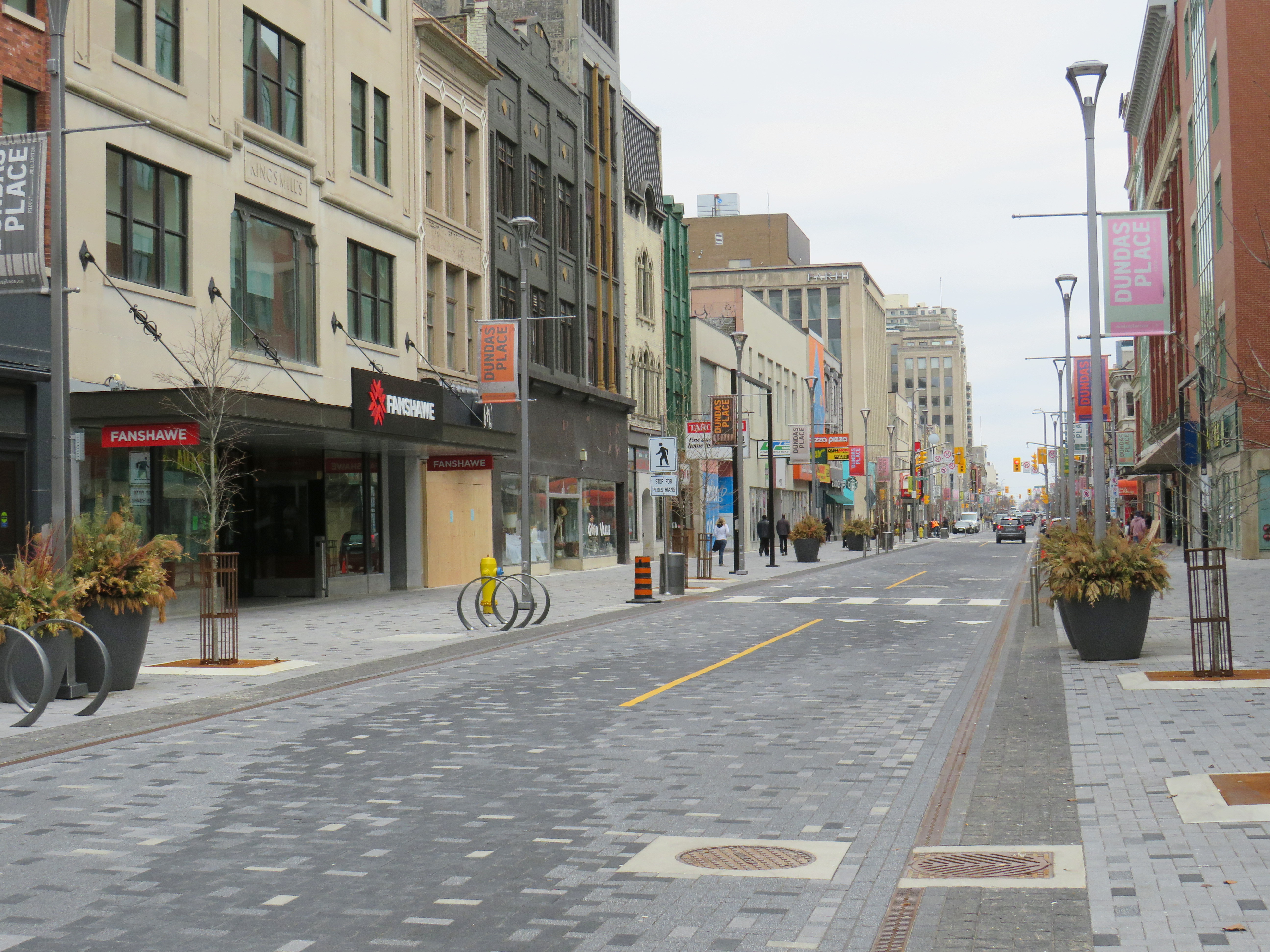 In London and Woodstock, Dundas Street formed the basis for each city’s downtown core. In London, it was recently rebuilt as a two-lane flexible street called Dundas Place, intended to host public events and revitalize the street, which has seen a loss of business to suburban malls and big box stores and to trendier bars and restaurants on Richmond Street, closer to Western University.
