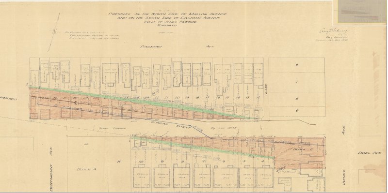 But by the early 1910s, Dundas Street was extended eastward, at first to Bathurst Street, following Arthur Street — which was widened to permit Toronto Railway Company streetcars — and then east to Yonge via St. Patrick, Anderson, and Agnes Streets. Jogs between these streets were slowly realigned, starting with the St. Patrick-Anderson-Agnes jogs between McCaul Street and University Avenue. However, it wasn’t until 1953 that the jog between former Arthur and St. Patrick Streets at Bathurst Street was eliminated. Scadding Court Community Centre now sits on the old roadway, though a small part survives as the centre’s staff parking lot.