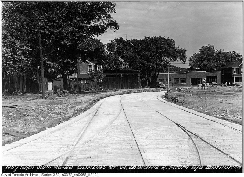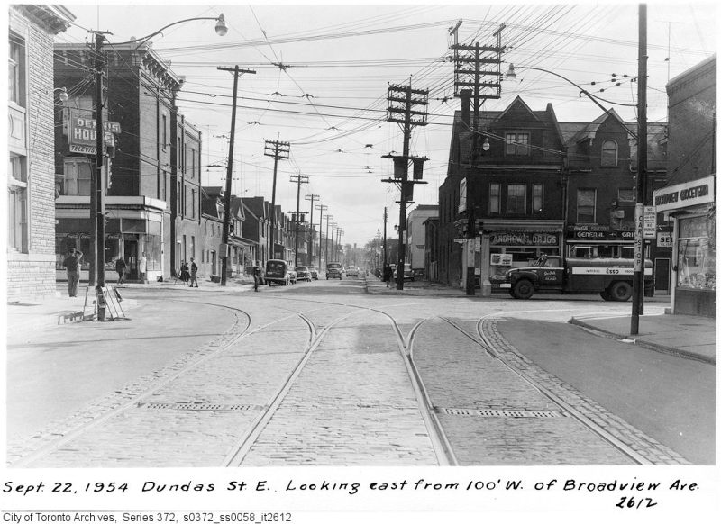 Though the early extensions of Dundas Street through the city simplified the street grid and allowed for through streetcar service between West Toronto and Broadview Avenue, the eastern extension built in the 1950s was done entirely for the benefit of the automobile.