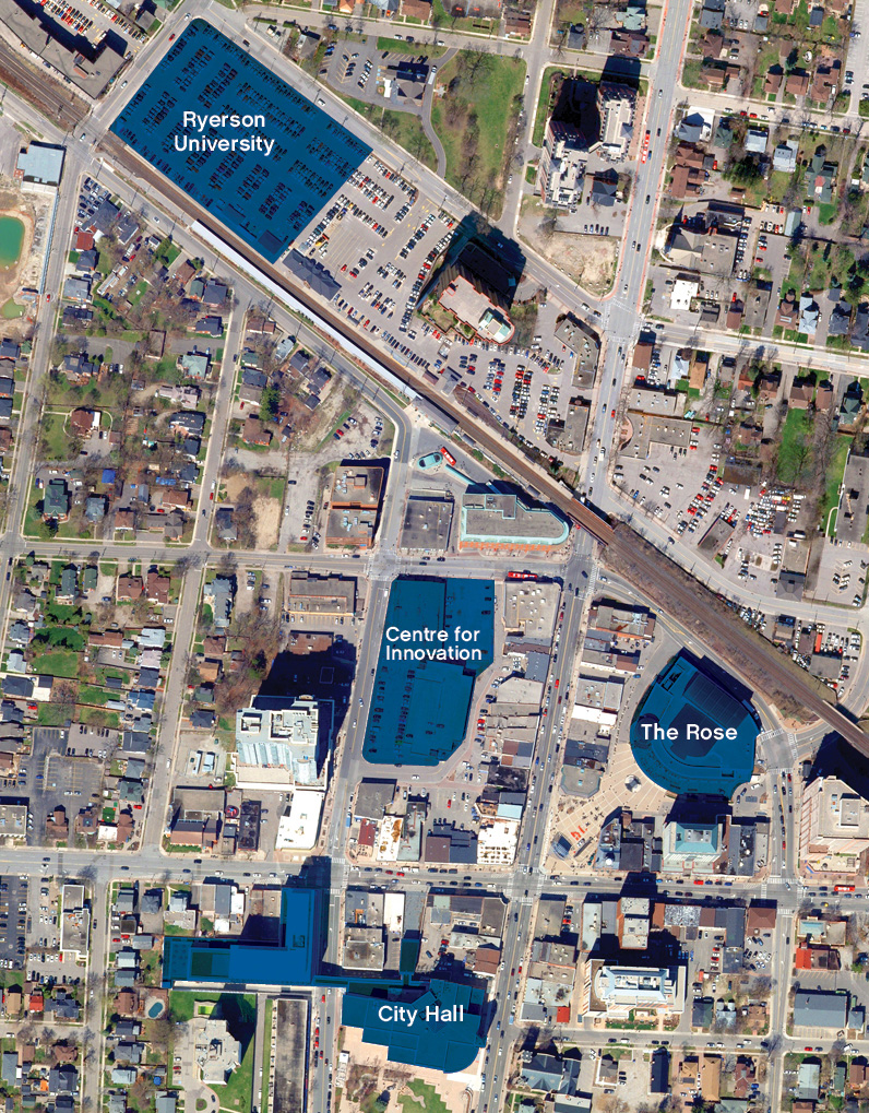 After the election of a new Progressive Conservative government led by Doug Ford, funding for the educational campus was pulled, though the City of Brampton and Ryerson University continued to advance plans for the downtown area. The city bought up more of the downtown core, including the southeast corner of George and Nelson Streets, across from the vacated office buildings, as well as the thirty-year old office building at 2 Nelson Street West, below which is the Brampton Transit downtown terminal. These newly acquired lands would be home to a larger bus terminal that would link to an expanded GO station and a proposed extension of the Hurontario LRT, and an Innovation Centre that would serve the education campus and include a new central library.