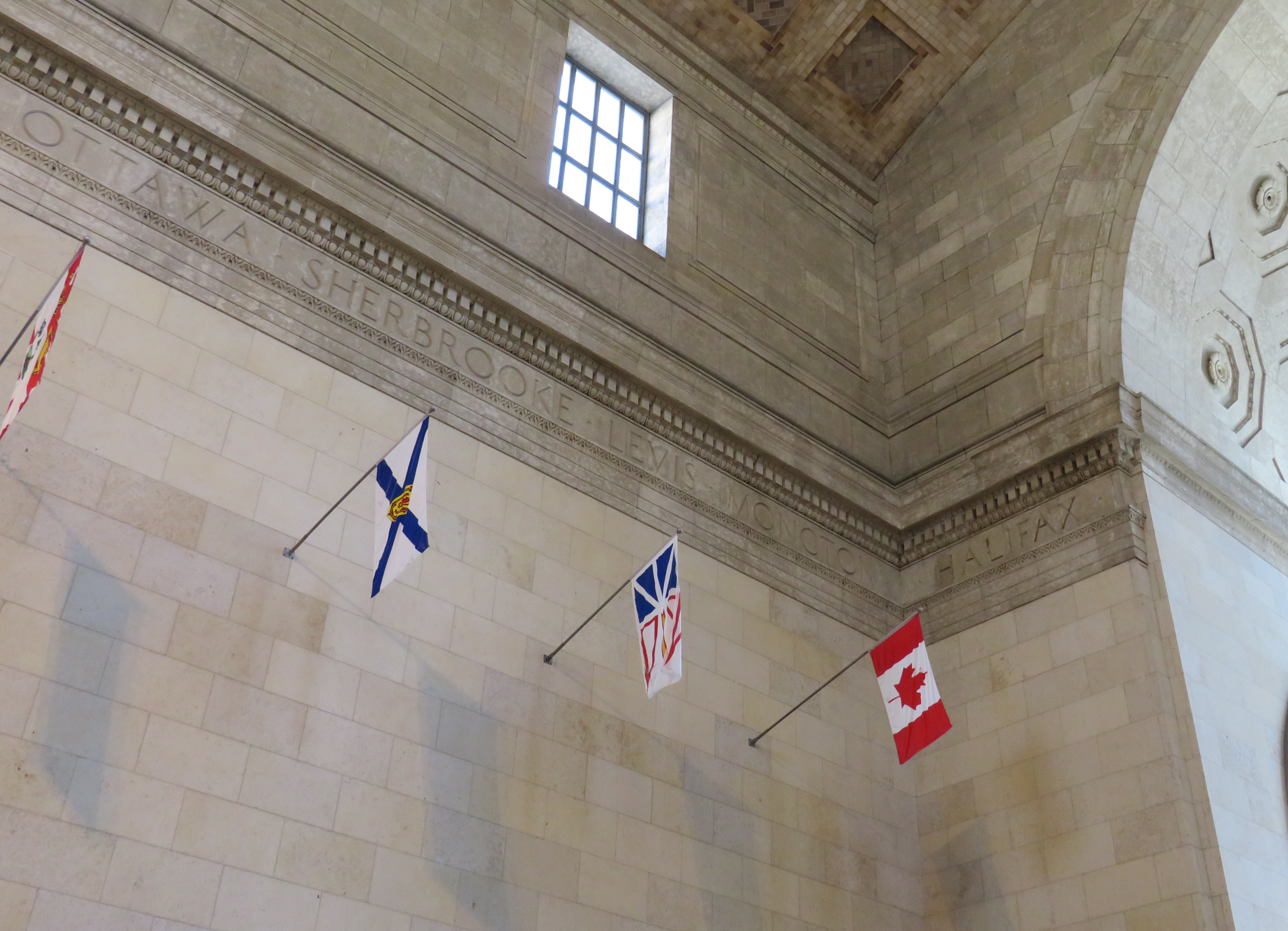 Up high, the names of 27 Canadian cities are carved into the walls. On the north side are the names of cities that were served primarily by the Canadian National Railway (the former Grand Trunk, Grand Trunk Pacific, National Transcontinental, Canadian Northern, and Intercolonial Railways, as existed in 1914-1918); on the south, were the names of cities served primarily by the Canadian Pacific Railway.