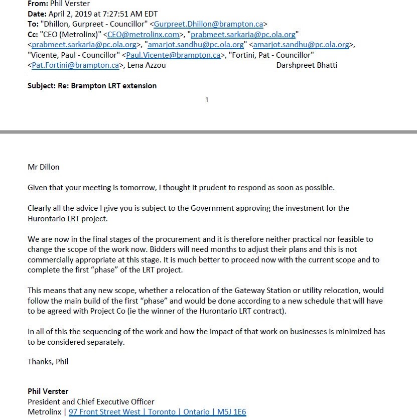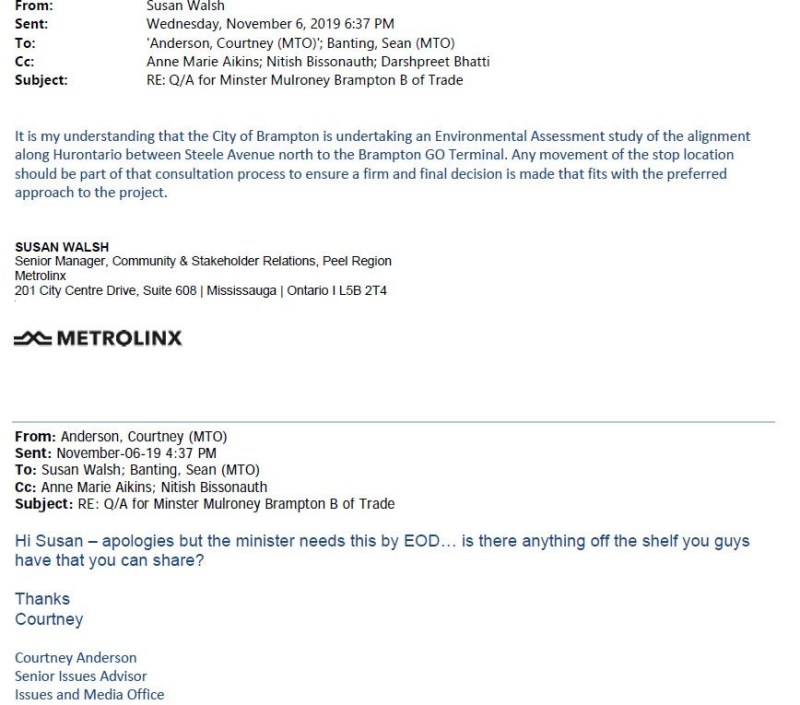 In the documents posted in this article, I have removed the email addresses for City of Brampton, MTO, and Metrolinx staff members, but I retained those of elected officials and those that are easily obtainable by a public search. I also removed all phone numbers within the various email threads, though they were not redacted in the documents I received.