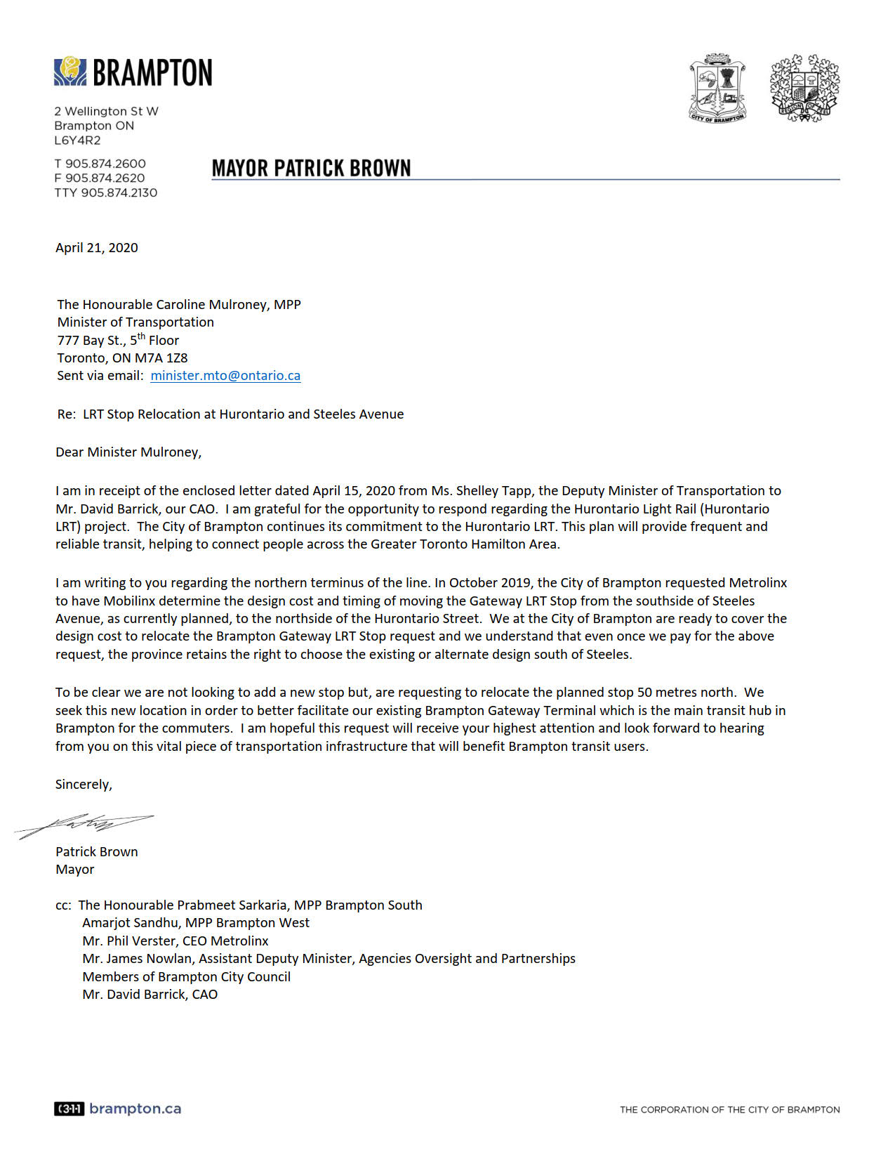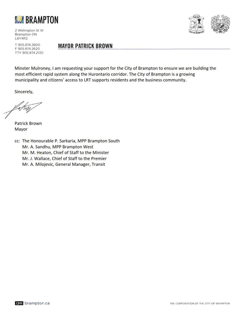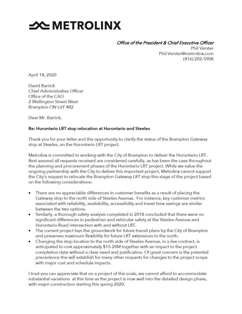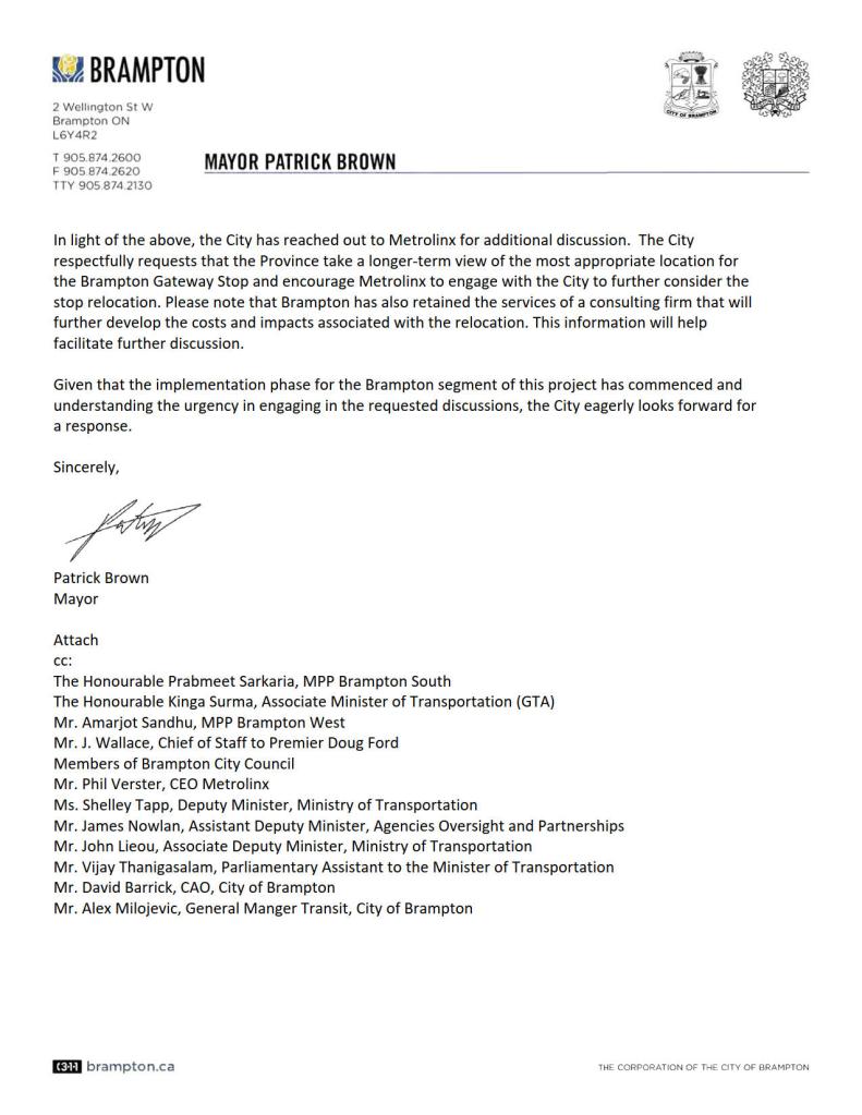 On April 21, 2020, Brampton Mayor Patrick Brown wrote to Caroline Mulroney, the Minister of Transportation. In that letter, Mayor Brown acknowledges receipt of the letter from the deputy minister. Brown notes that Brampton is prepared to cover the design costs to relocate the LRT stop, and that the city is not “looking to add a new stop but, are requesting to relocate the planned stop 50 metres north.”