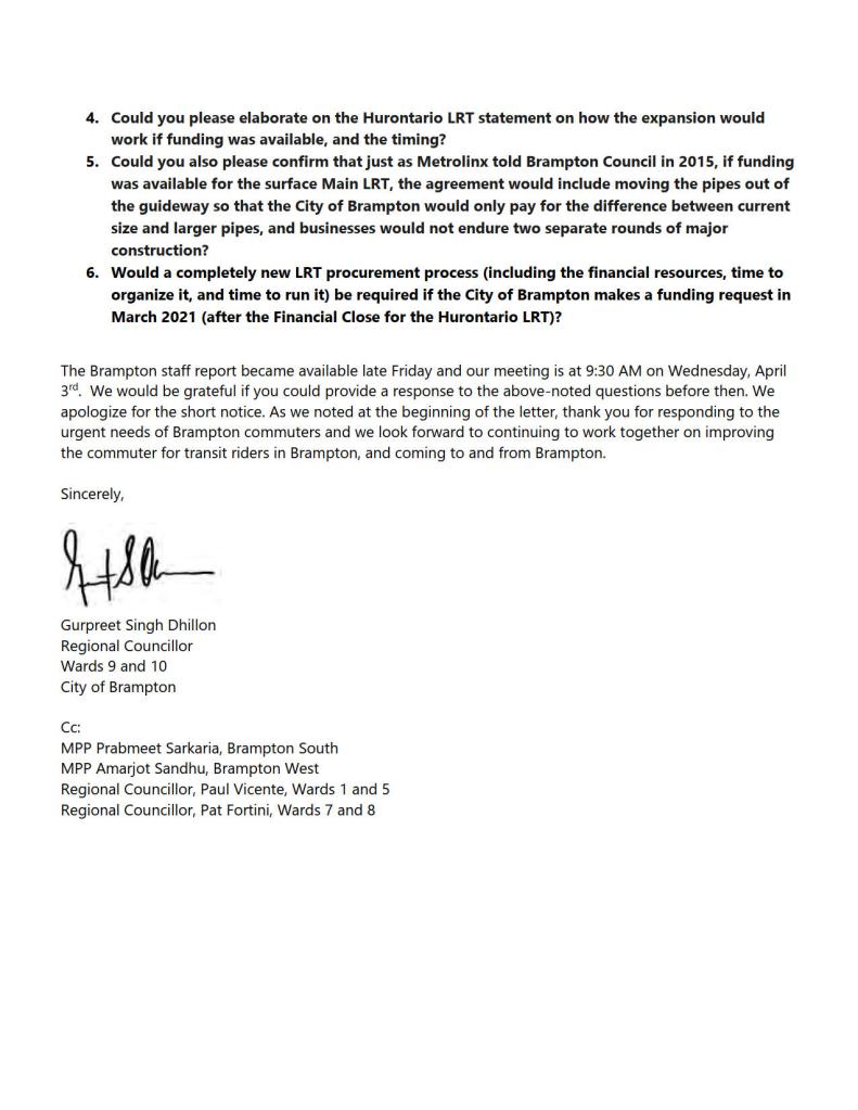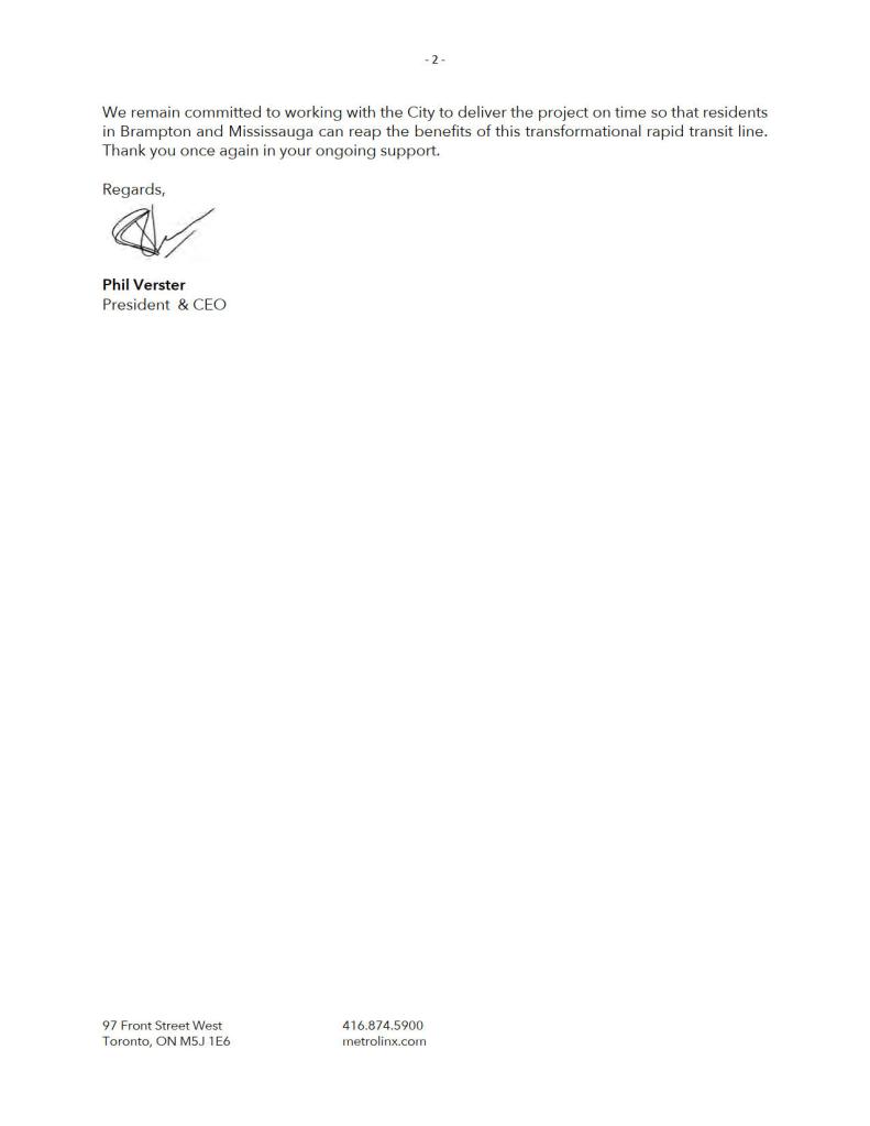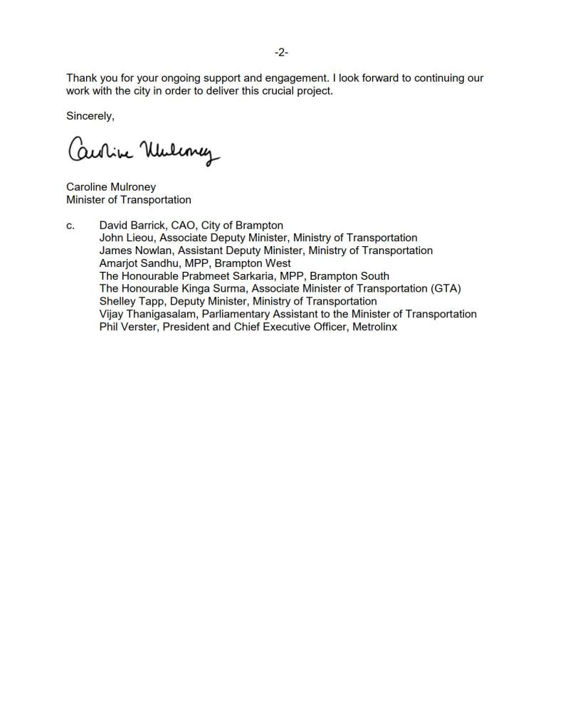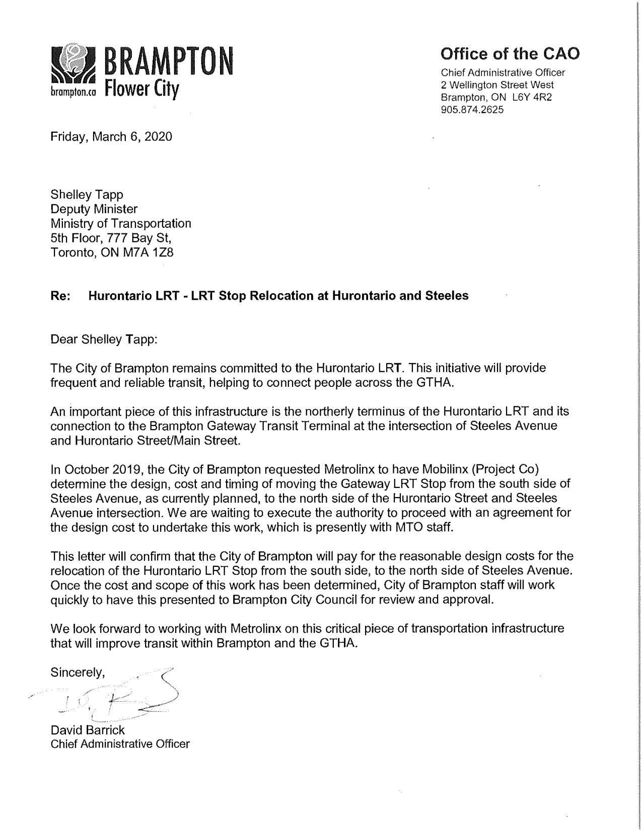 On April 21, 2020, Brampton Mayor Patrick Brown wrote to Caroline Mulroney, the Minister of Transportation. In that letter, Mayor Brown acknowledges receipt of the letter from the deputy minister. Brown notes that Brampton is prepared to cover the design costs to relocate the LRT stop, and that the city is not “looking to add a new stop but, are requesting to relocate the planned stop 50 metres north.”
