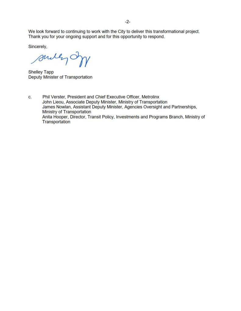 The response from Minister Mulroney was sympathetic, but firm in backing Metrolinx’s position. Provincial funding for moving the stop would not be made available and that “given the scale of this project and the commitment to ensure milestones are met, the province and Metrolinx will be continuing work on the project as currently planned.”